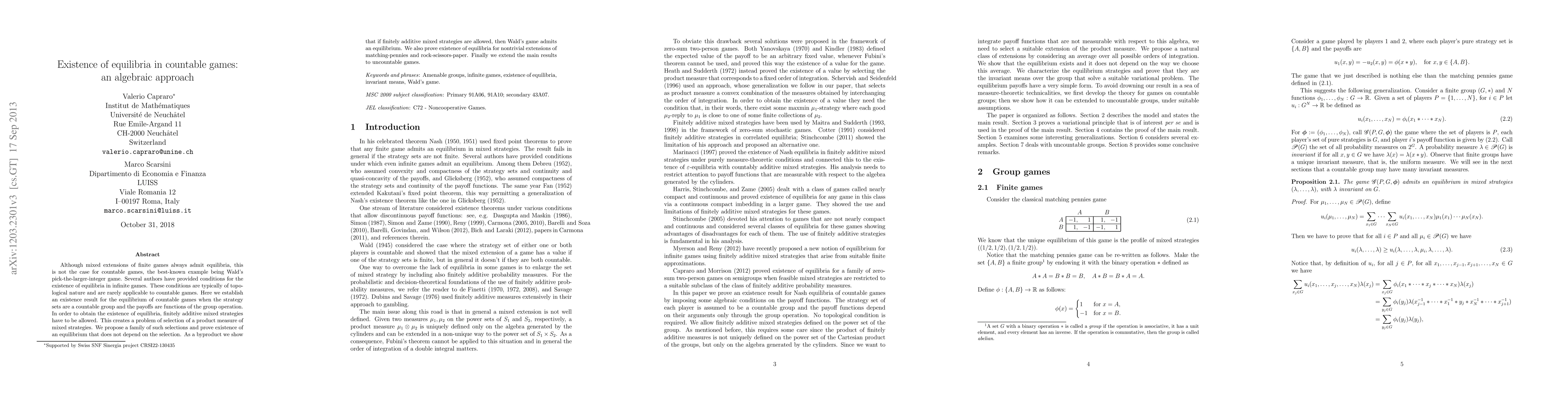 This paper establishes the existence of equilibria in countable games where strategy sets are countable groups and payoffs depend on group operations, using finitely additive mixed strategies. It proposes a selection method for product measures and proves equilibrium existence without dependence on the selection, extending the results to uncountable games.