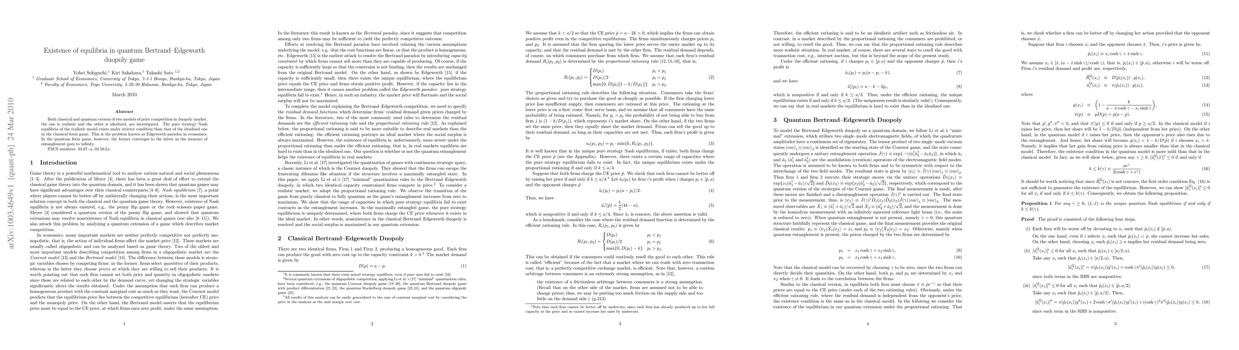 This paper investigates equilibrium existence in quantum Bertrand-Edgeworth duopoly game, finding that classical model's realistic scenario converges to the idealized one as entanglement increases, resolving the Edgeworth paradox.
