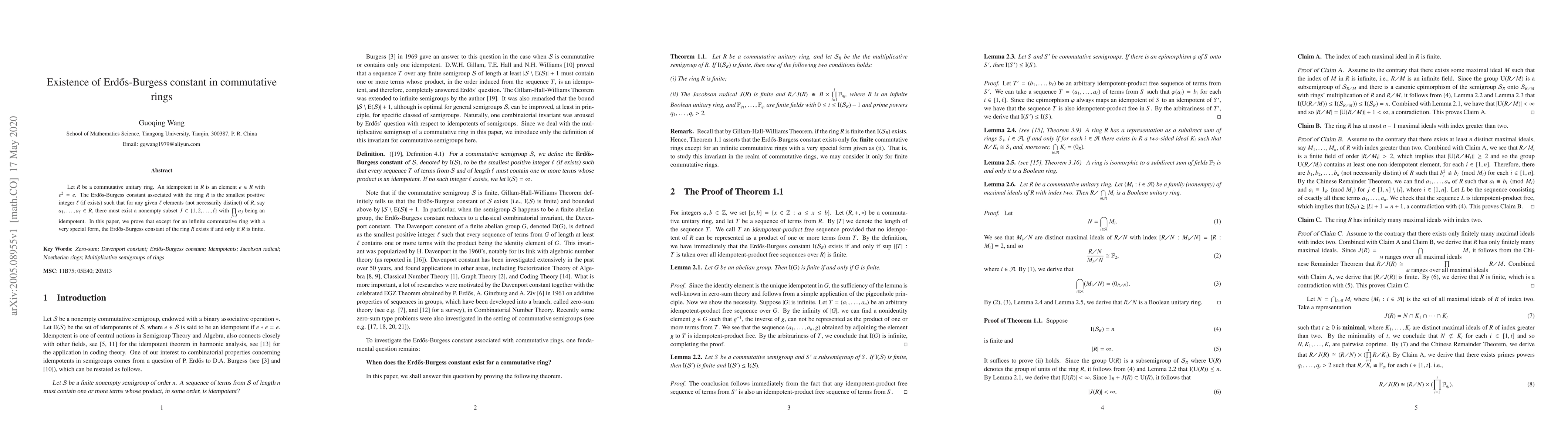 This paper investigates the existence of the Erdős-Burgess constant in commutative unitary rings, proving that it exists if and only if the ring is finite, except for an infinite ring with a specific structure.