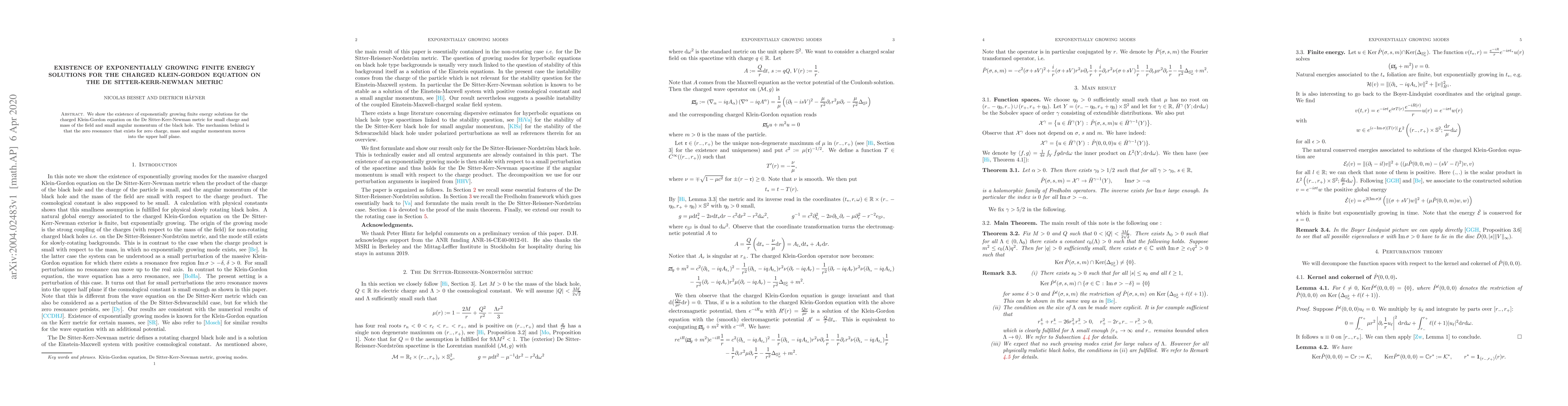 This paper demonstrates the existence of exponentially growing finite energy solutions for the charged Klein-Gordon equation on the De Sitter-Kerr-Newman metric, revealing that the zero resonance shifts into the upper half plane for small charge, mass, and angular momentum.