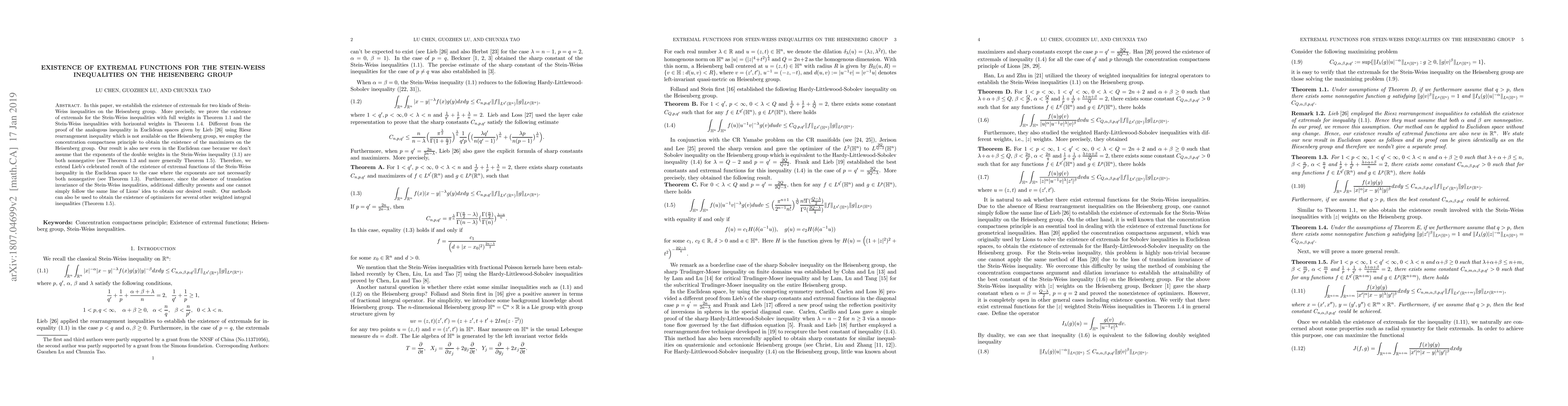 This paper establishes the existence of extremals for Stein-Weiss inequalities on the Heisenberg group using the concentration compactness principle, extending Lieb's result for Euclidean spaces to cases where the exponents are not necessarily both nonnegative. The methods also apply to other weighted integral inequalities.