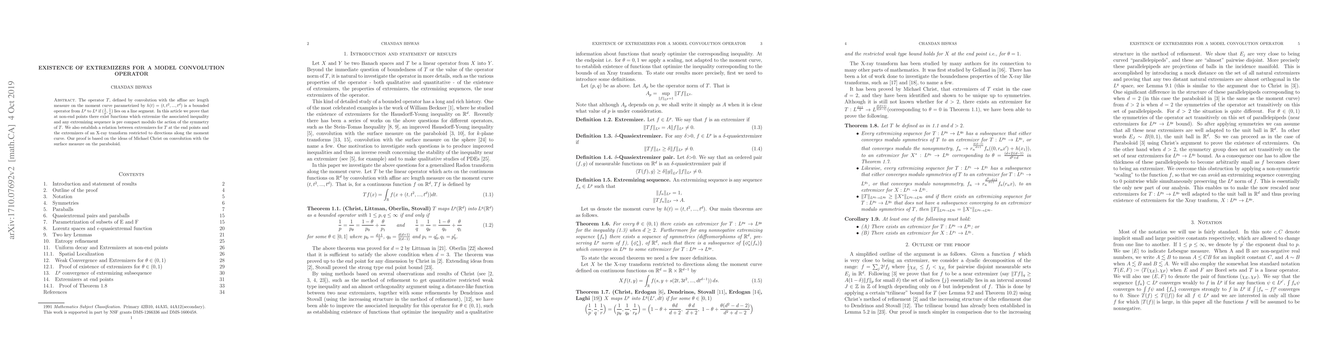 The paper proves that extremizers for a model convolution operator exist at non-end points, and establishes a relation between these extremizers and the X-ray transform in specific directions.