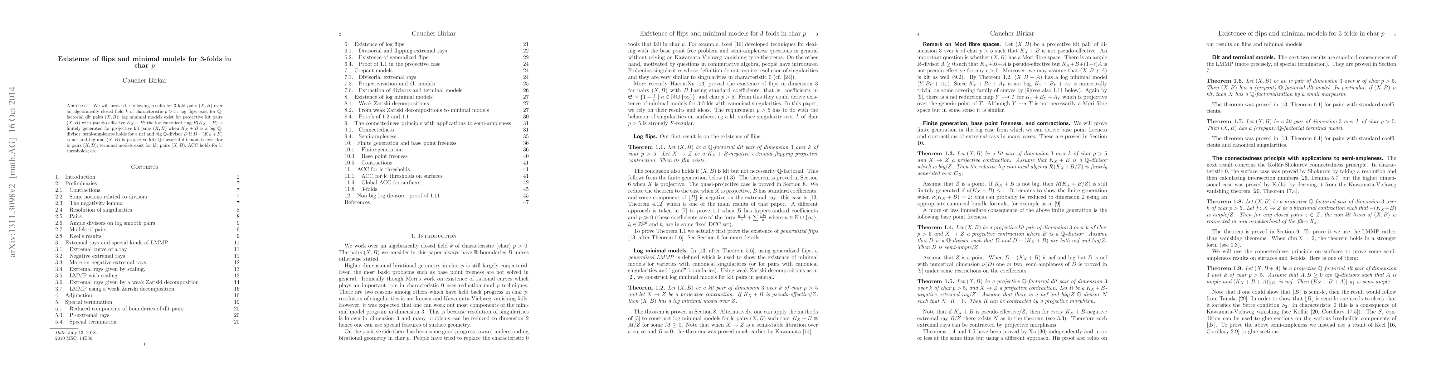 This paper proves the existence of log flips and minimal models for $\Q$-factorial dlt pairs of $3$-folds in characteristic $p>5$, establishes the finite generation of log canonical rings for projective klt pairs, and confirms semi-ampleness for certain nef and big divisors under specific conditions.