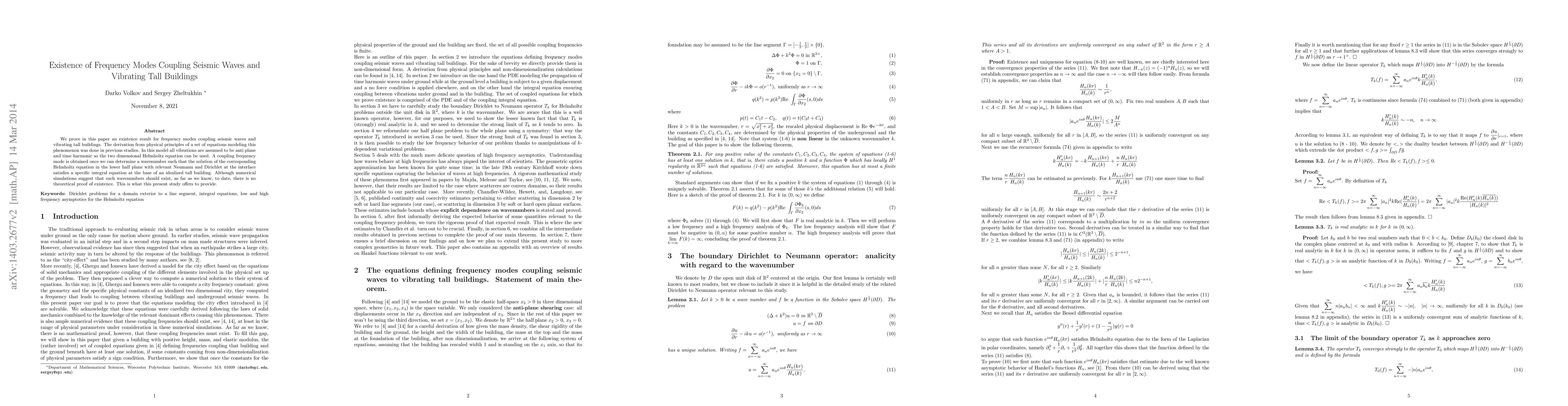 This paper provides a theoretical proof for the existence of frequency modes coupling seismic waves with the vibrations of tall buildings, addressing a gap left by previous numerical simulations. The study uses the two-dimensional Helmholtz equation and relevant boundary conditions to derive a specific integral equation at the base of the building.