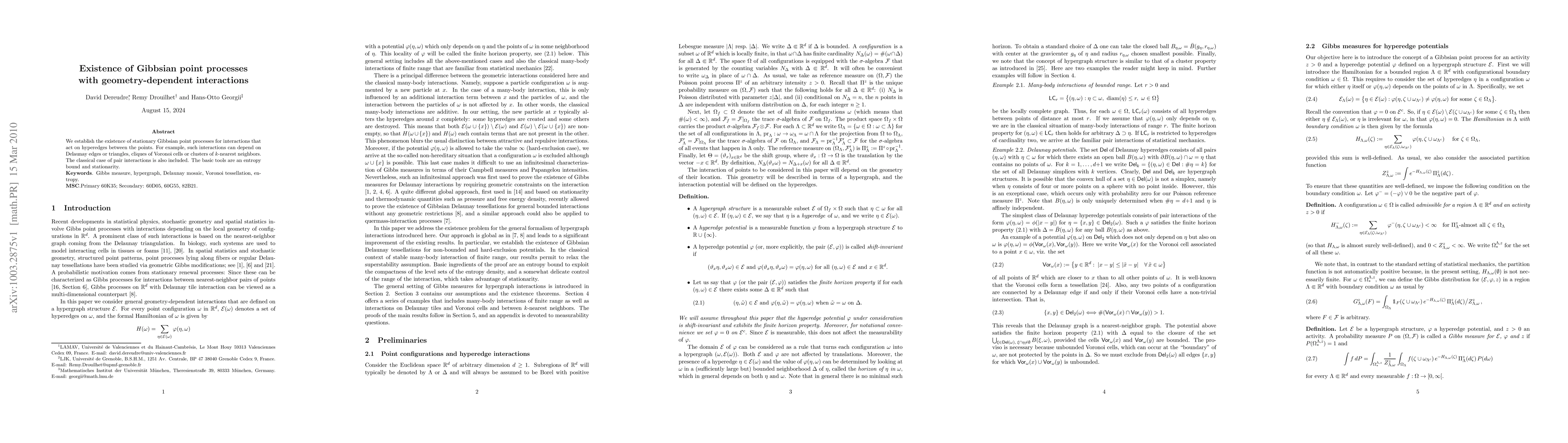 This paper establishes the existence of stationary Gibbsian point processes with geometry-dependent interactions, such as those based on Delaunay edges or Voronoi clusters, using entropy bounds and stationarity as key tools. The classical pair interactions are also covered within this framework.