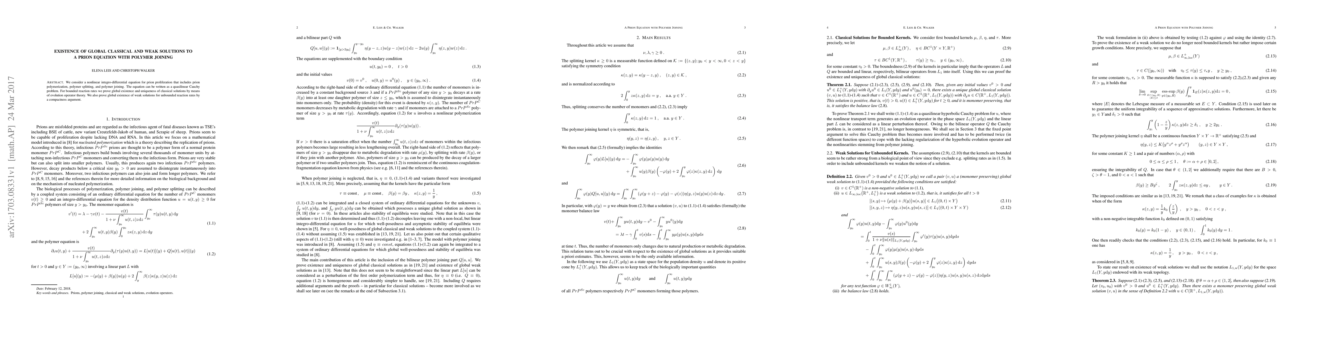 Researchers proved global existence of classical solutions for a prion equation with polymer joining under bounded reaction rates, and weak solutions under unbounded reaction rates.