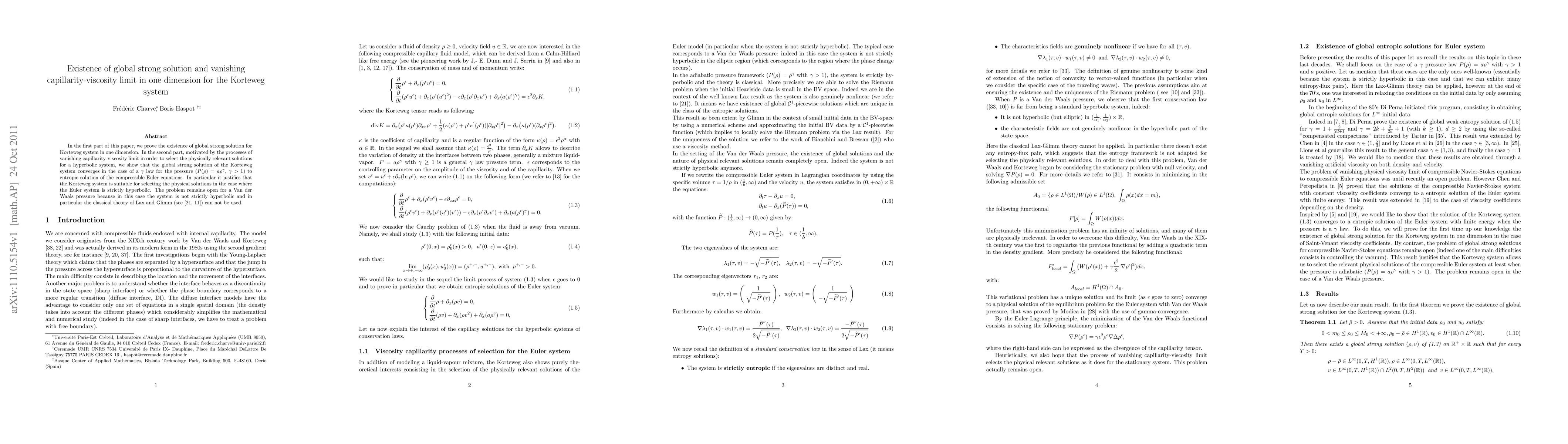 This paper proves the existence of a global strong solution for the Korteweg system in one dimension and demonstrates that this solution converges to the entropic solution of the compressible Euler equations under a $\gamma$ law for pressure, thus justifying the Korteweg system's suitability for selecting physical solutions when the Euler system is strictly hyperbolic. The problem remains unresolved for a Van der Waals pressure due to non-strict hyperbolicity.