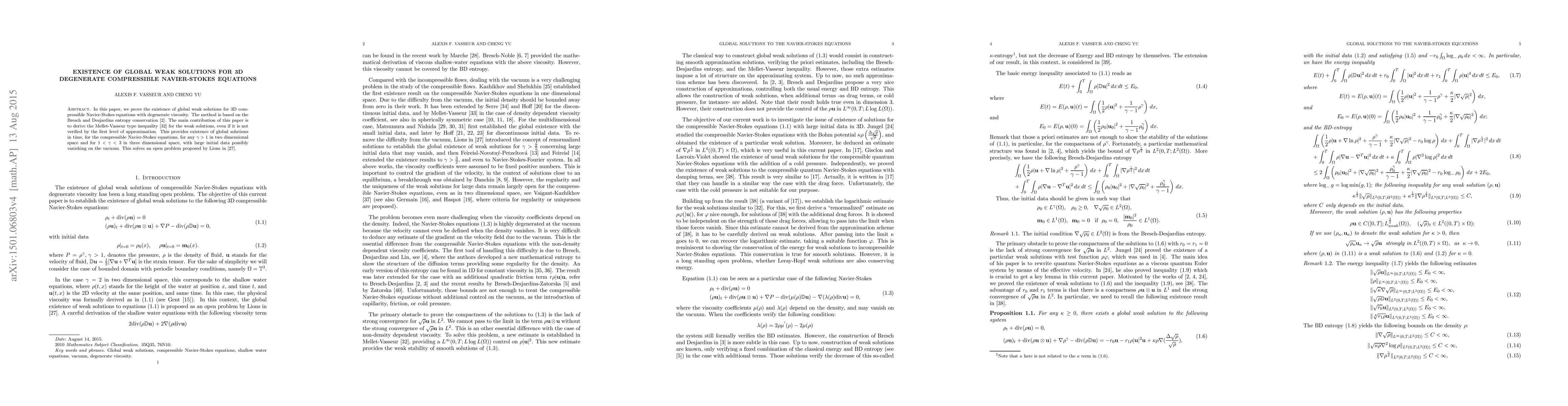 This paper establishes the existence of global weak solutions for 3D compressible Navier-Stokes equations with degenerate viscosity, utilizing the Bresch and Desjardins entropy conservation method. The key result is the derivation of a Mellet-Vasseur type inequality for the weak solutions, solving an open problem proposed by Lions.