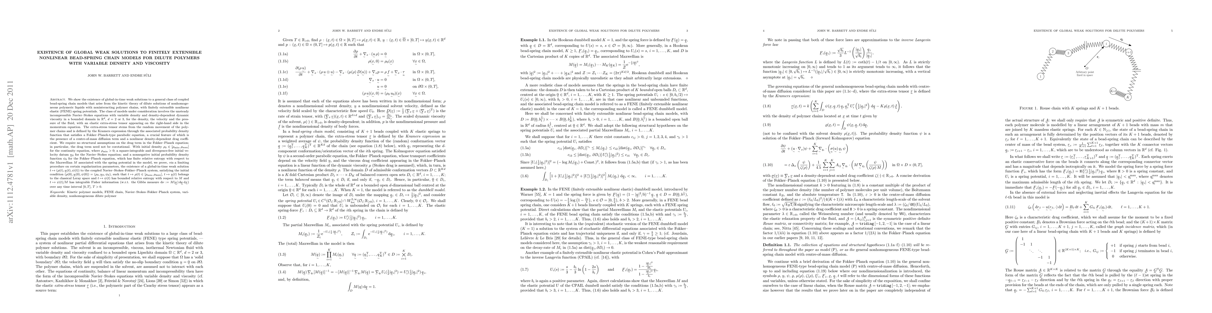 This paper establishes the existence of global-in-time weak solutions to bead-spring chain models for dilute polymers with variable density and viscosity, incorporating the Navier-Stokes equations and a Fokker-Planck equation to describe the polymer dynamics. The study proves the existence of solutions under bounded initial conditions and a regularization procedure.