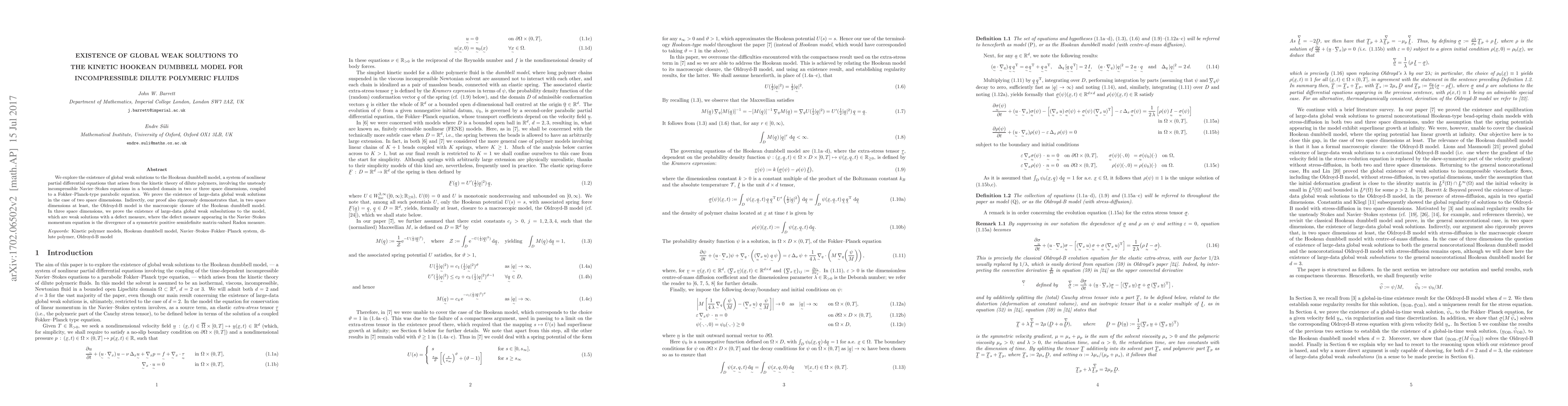 We explore the existence of global weak solutions to the Hookean dumbbell model, a system of nonlinear partial differential equations that arises from the kinetic theory of dilute polymers, involving the unsteady incompressible Navier--Stokes equations in a bounded domain in two or three space dimensions, coupled to a Fokker--Planck-type parabolic equation. We prove the existence of large-data global weak solutions in the case of two space dimensions. Indirectly, our proof also rigorously demonstrates that, in two space dimensions at least, the Oldroyd-B model is the macroscopic closure of the Hookean dumbbell model. In three space dimensions, we prove the existence of large-data global weak subsolutions to the model, which are weak solutions with a defect measure, where the defect measure appearing in the Navier--Stokes momentum equation is the divergence of a symmetric positive semidefinite matrix-valued Radon measure.