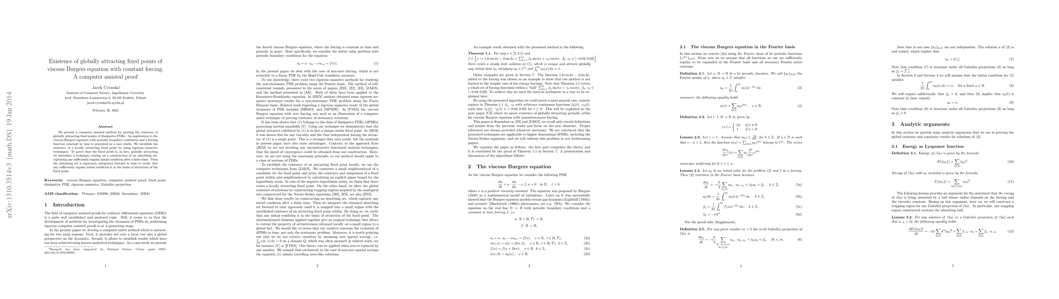 This paper presents a computer-assisted method to prove the existence of globally attracting fixed points for viscous Burgers' equation with constant forcing. It establishes a locally attracting fixed point using rigorous numerics and proves global attraction by constructing an absorbing set and rigorously integrating it forward in time.