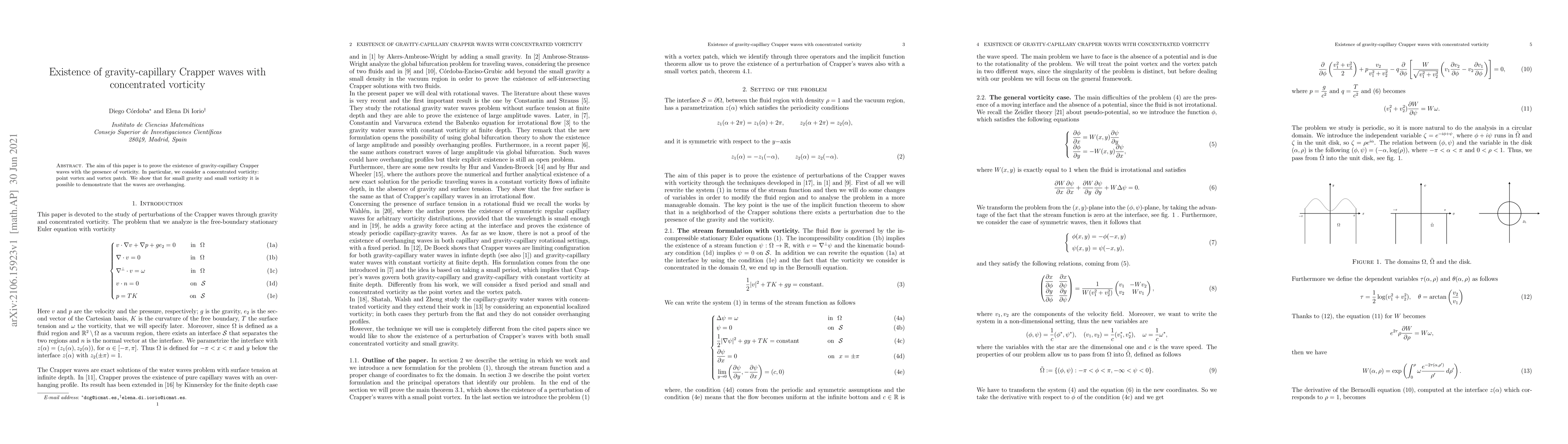 The aim of this paper is to prove the existence of gravity-capillary Crapper waves with the presence of vorticity. In particular, we consider a concentrated vorticity: point vortex and vortex patch. We show that for small gravity and small vorticity it is possible to demonstrate that the waves are overhanging.
