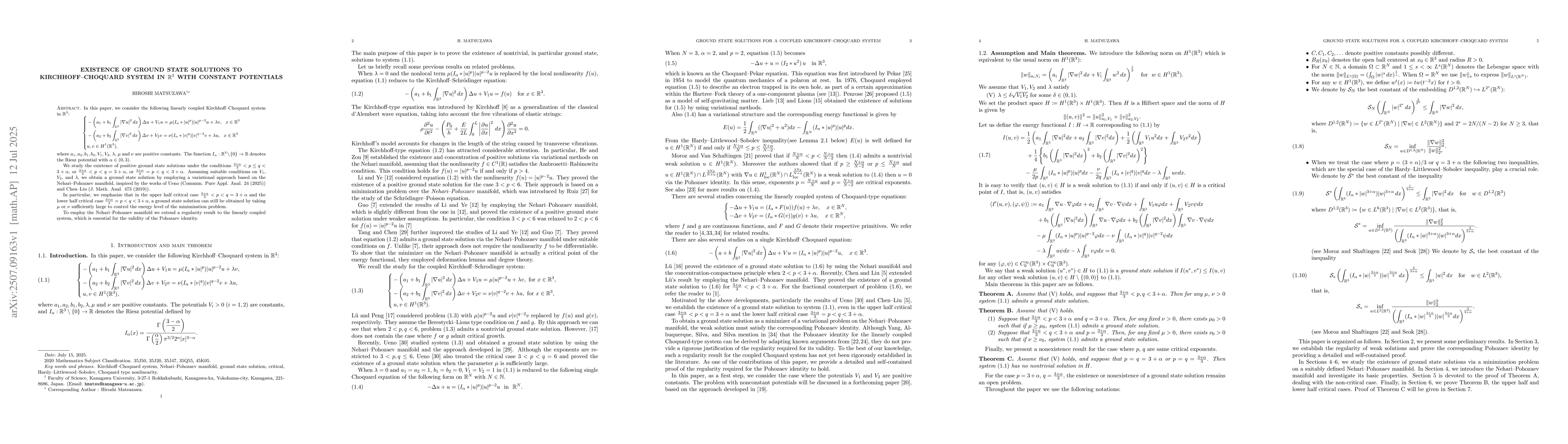 In this paper, we consider the following linearly coupled Kirchhoff--Choquard system in $\mathbb{R}^3$: \begin{align*} \begin{cases} -\left(a_1 + b_1\int_{\mathbb{R}^3} |\nabla u|^2\,dx\right)\Delta u + V_1 u = \mu (I_{\alpha} * |u|^p) |u|^{p - 2} u + \lambda v, \ \ x\in\mathbb{R}^3\\ -\left(a_2 + b_2\int_{\mathbb{R}^3} |\nabla v|^2\,dx\right)\Delta v + V_2 v = \nu (I_{\alpha} * |v|^q) |v|^{q - 2} v + \lambda u,\ \ x\in\mathbb{R}^3 \\ u, v \in H^1(\mathbb{R}^3), \end{cases} \end{align*} where $a_1, a_2, b_1, b_2, V_1, V_2$, $\lambda$, $\mu$ and $\nu$ are positive constants. The function $I_{\alpha} : \mathbb{R}^3 \setminus \{0\} \to \mathbb{R}$ denotes the Riesz potential with $\alpha \in (0, 3)$. We study the existence of positive ground state solutions under the conditions $\frac{3 + \alpha}{3} < p \le q < 3 + \alpha$, or $\frac{3 + \alpha}{3} < p < q = 3 + \alpha$, or $\frac{3 + \alpha}{3} = p < q < 3 + \alpha$. Assuming suitable conditions on $V_1$, $V_2$, and $\lambda$, we obtain a ground state solution by employing a variational approach based on the Nehari--Pohozaev manifold, inspired by the works of Ueno (Commun. Pure Appl. Anal. 24 (2025)) and Chen--Liu (J. Math. Anal. 473 (2019)). In particular, we emphasize that in the upper half critical case $\frac{3 + \alpha}{3} < p < q = 3 + \alpha$ and the lower half critical case $\frac{3 + \alpha}{3} = p < q < 3 + \alpha$, a ground state solution can still be obtained by taking $\mu$ or $\nu$ sufficiently large to control the energy level of the minimization problem. To employ the Nehari--Pohozaev manifold we extend a regularity result to the linearly coupled system, which is essential for the validity of the Pohozaev identity.