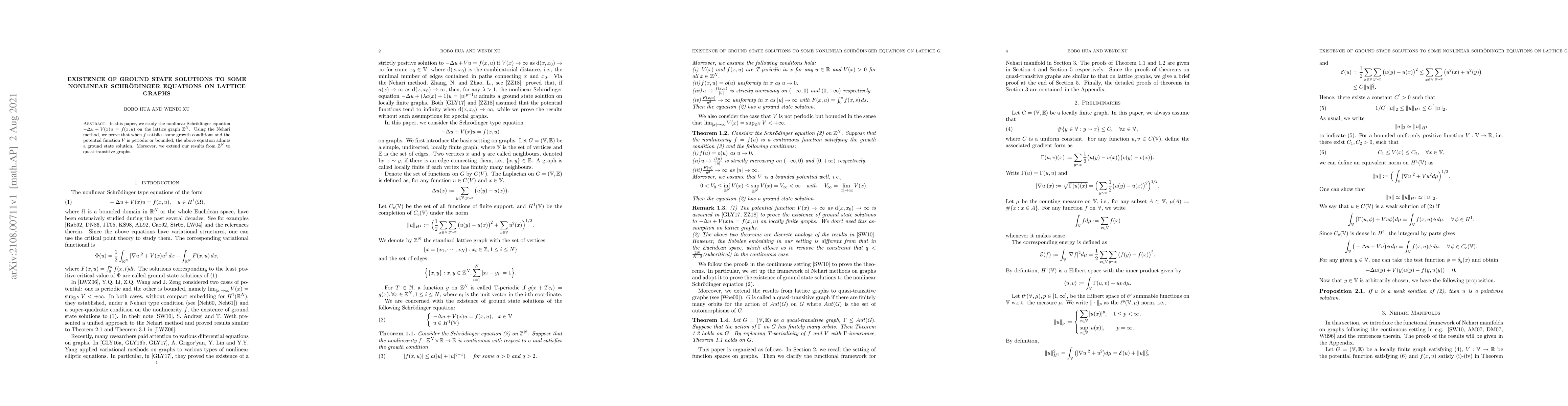 This paper investigates the existence of ground state solutions for the nonlinear Schrödinger equation on lattice graphs using the Nehari method. It proves the existence of such solutions under specific growth conditions on $f$ and periodic or bounded potential functions $V$, extending the results to quasi-transitive graphs.