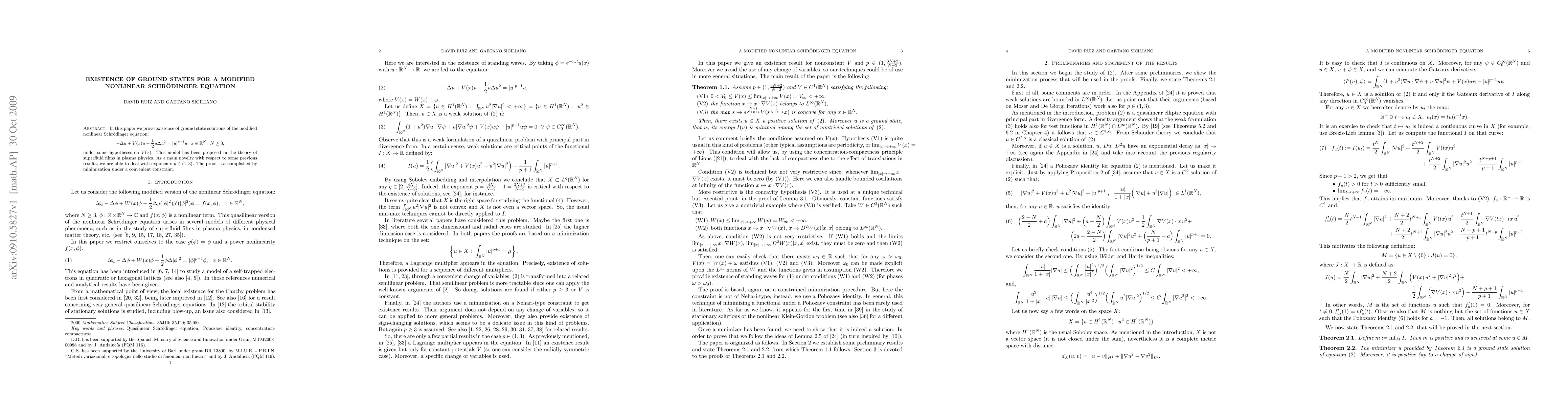 In this paper we prove existence of ground state solutions of the modified nonlinear Schrodinger equation: $$ -\Delta u+V(x)u-{1/2}u \Delta u^{2}=|u|^{p-1}u, x \in \R^N, N \geq 3, $$ under some hypotheses on $V(x)$. This model has been proposed in the theory of superfluid films in plasma physics. As a main novelty with respect to some previous results, we are able to deal with exponents $p\in(1,3)$. The proof is accomplished by minimization under a convenient constraint.