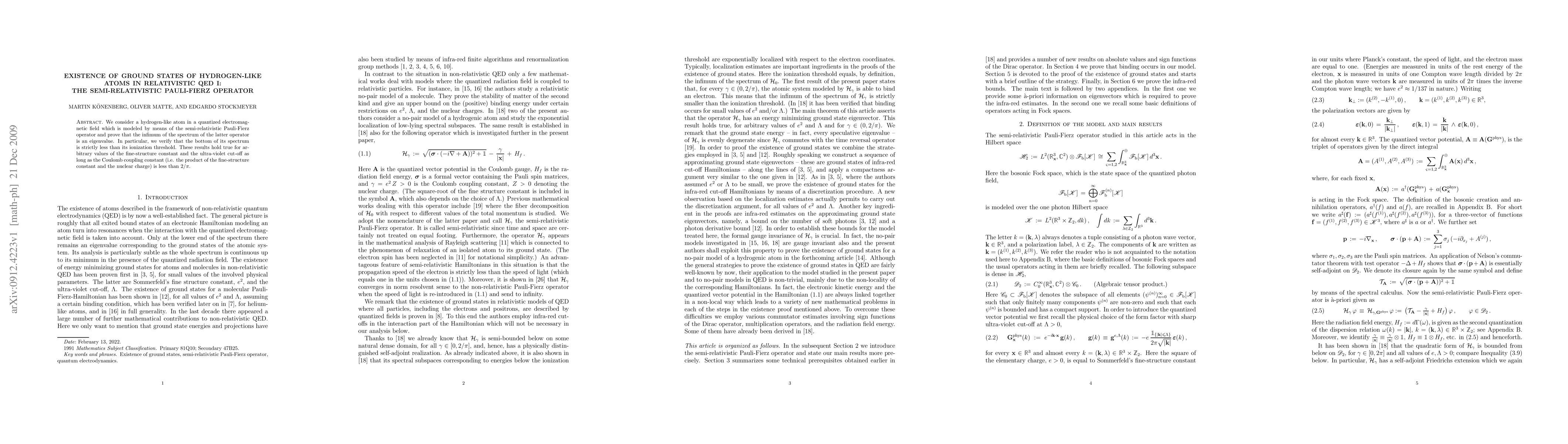 Researchers prove that ground states of hydrogen-like atoms exist in a relativistic quantum field, with the energy lower than its ionization threshold for certain conditions.