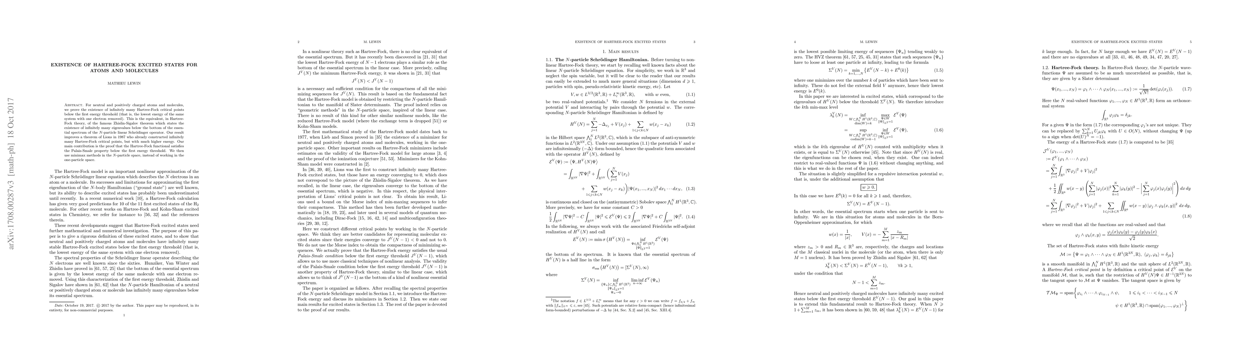 This paper proves the existence of infinitely many Hartree-Fock excited states for atoms and molecules below the first energy threshold, improving upon previous results by showing lower energy critical points. The authors demonstrate the Palais-Smale property for the Hartree-Fock functional and utilize minimax methods in the $N$-particle space.