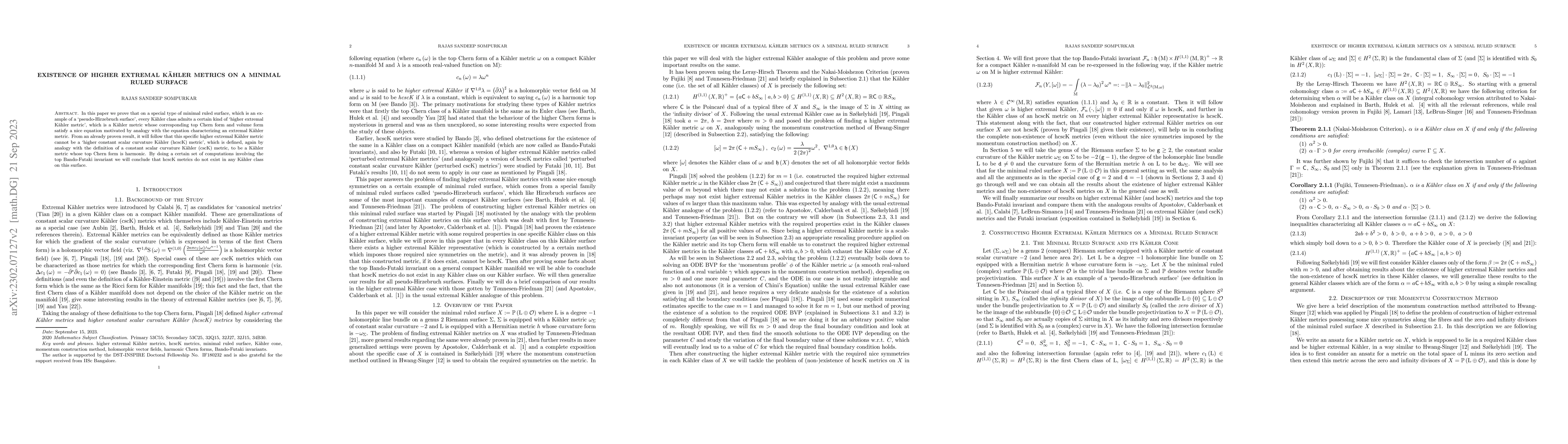 In this paper we prove that on a special type of minimal ruled surface, which is an example of a `pseudo-Hirzebruch surface', every K\"ahler class admits a certain kind of `higher extremal K\"ahler metric', which is a K\"ahler metric whose corresponding top Chern form and volume form satisfy a nice equation motivated by analogy with the equation characterizing an extremal K\"ahler metric. From an already proven result, it will follow that this specific higher extremal K\"ahler metric cannot be a `higher constant scalar curvature K\"ahler (hcscK) metric', which is defined, again by analogy with the definition of a constant scalar curvature K\"ahler (cscK) metric, to be a K\"ahler metric whose top Chern form is harmonic. By doing a certain set of computations involving the top Bando-Futaki invariant we will conclude that hcscK metrics do not exist in any K\"ahler class on this surface.