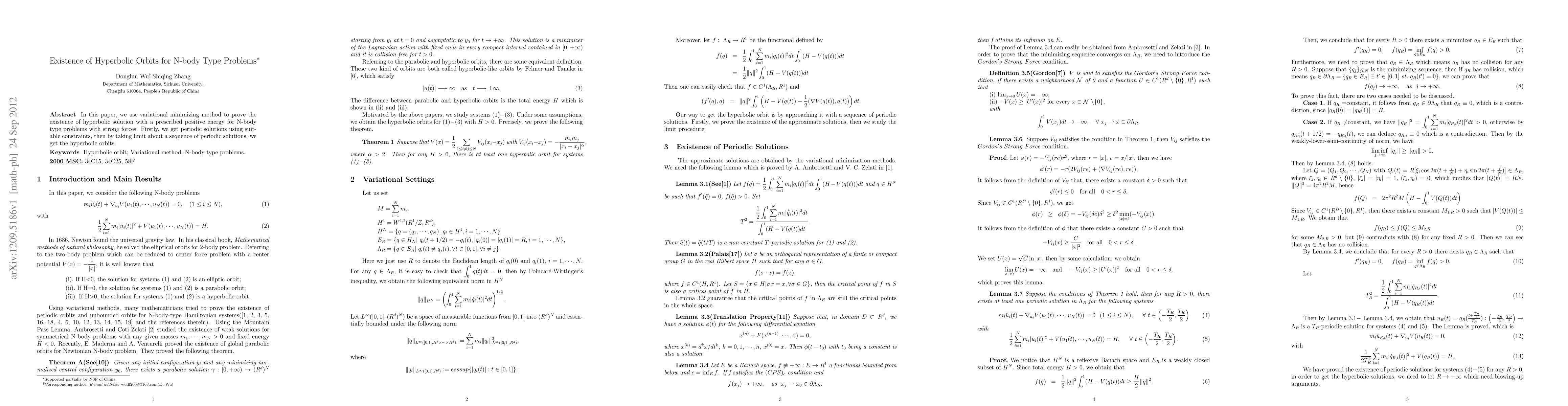 This paper proves the existence of hyperbolic orbits in N-body problems with strong forces using variational methods. It first finds periodic solutions under constraints and then derives hyperbolic orbits by taking limits of these periodic solutions.