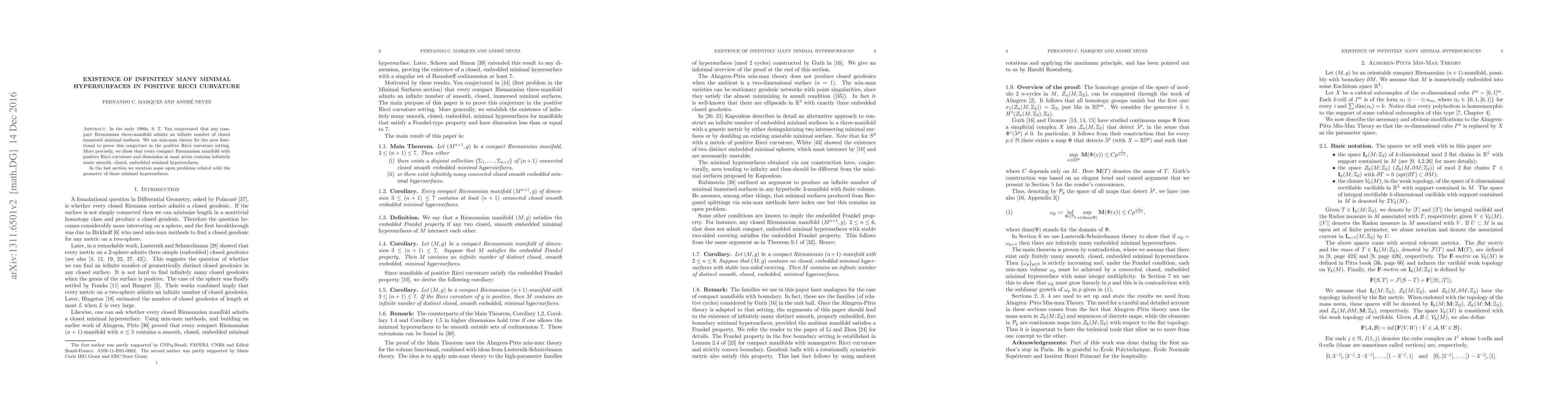 This paper proves S. T. Yau's conjecture that compact Riemannian three-manifolds with positive Ricci curvature contain infinitely many closed minimal surfaces using min-max theory. It extends the result to dimensions up to seven.