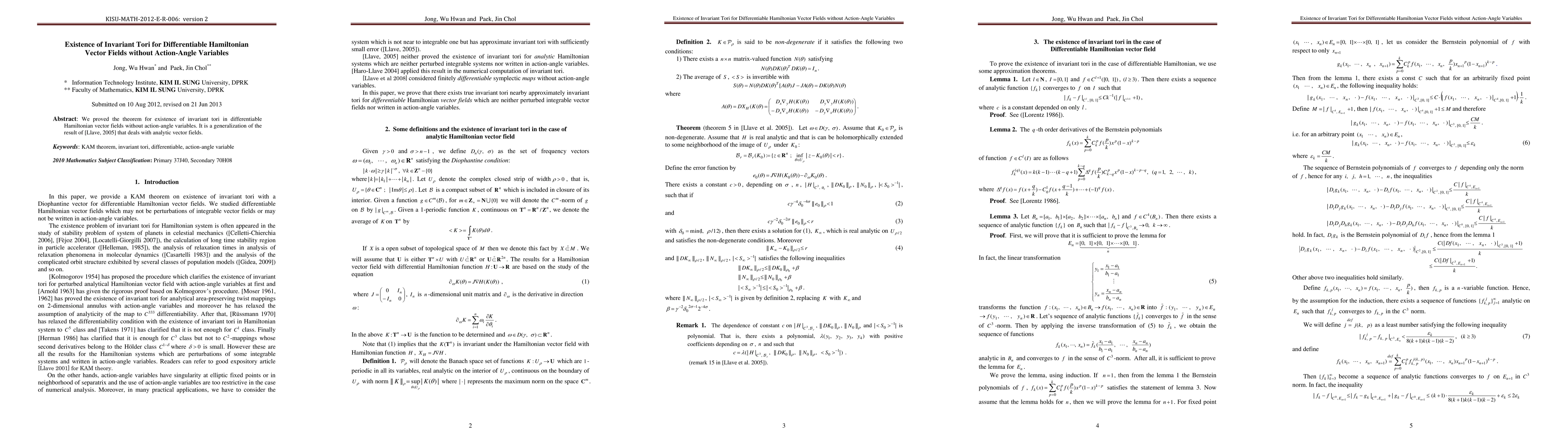 Summary: The paper proves the existence of invariant tori in differentiable Hamiltonian vector fields without relying on action-angle variables, generalizing a previous result by Llave (2005) for analytic vector fields. This provides a broader applicability for Hamiltonian systems.