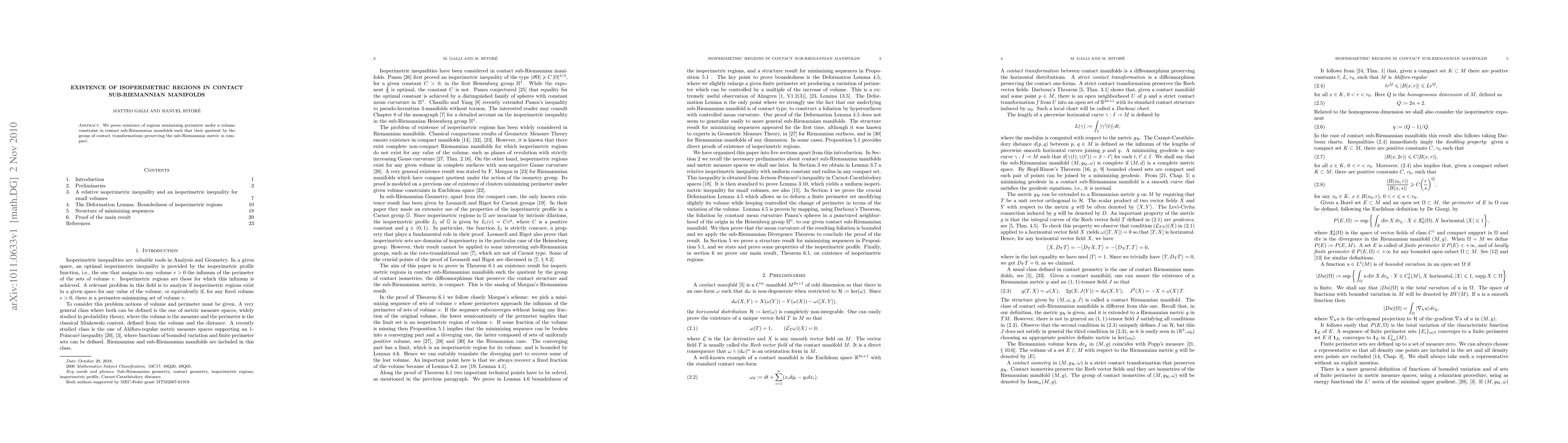 Summary: The paper proves the existence of regions in contact sub-Riemannian manifolds that minimize perimeter relative to a volume constraint, ensuring the quotient by contact transformations preserving the metric is compact. This establishes isoperimetric regions within these geometric structures.