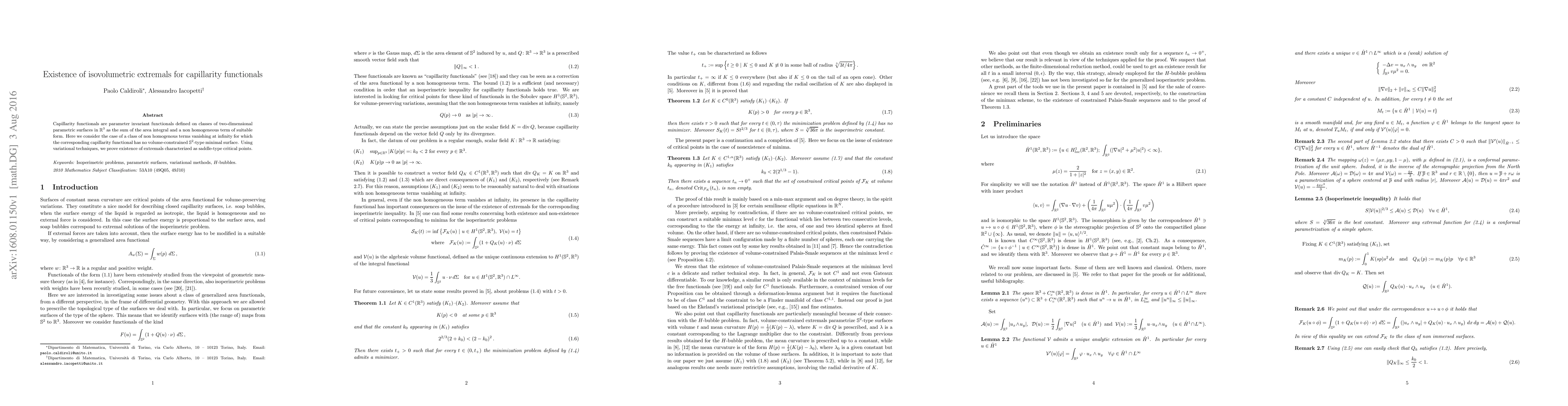 This paper proves the existence of isovolumetric extremals for capillarity functionals, which combine area integrals and non-homogeneous terms. Despite the absence of volume-constrained minimal surfaces, the study utilizes variational techniques to establish the presence of saddle-type critical points as extremals.