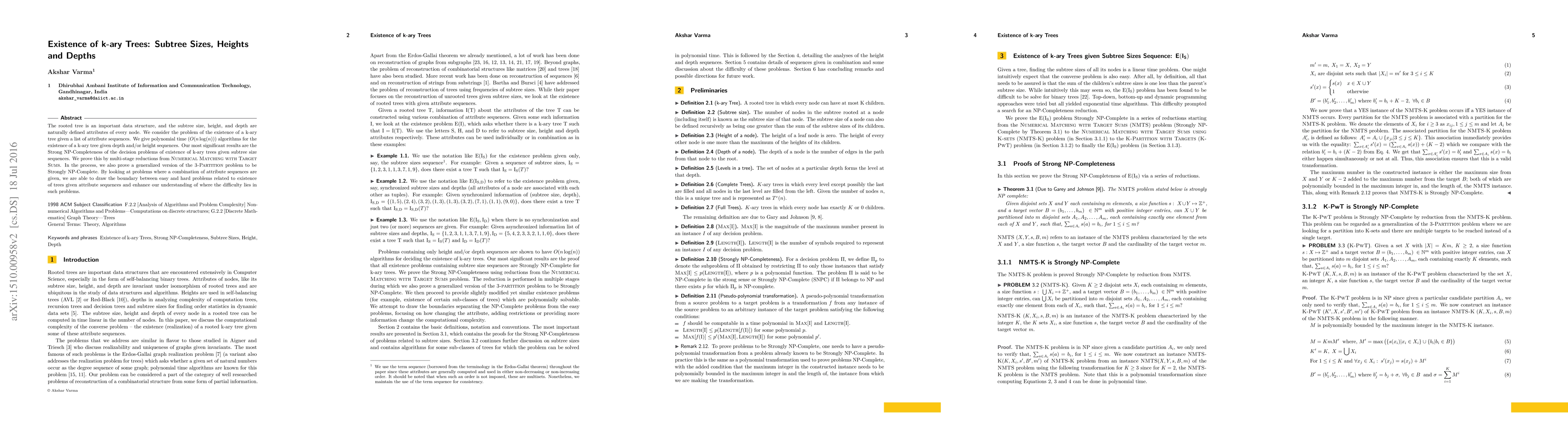 This paper explores the existence of k-ary trees given sequences of subtree sizes, heights, and depths. It presents polynomial-time algorithms for trees defined by depth and/or height sequences, while proving the Strong NP-Completeness of existence problems defined by subtree size sequences through reductions from numerical matching problems.