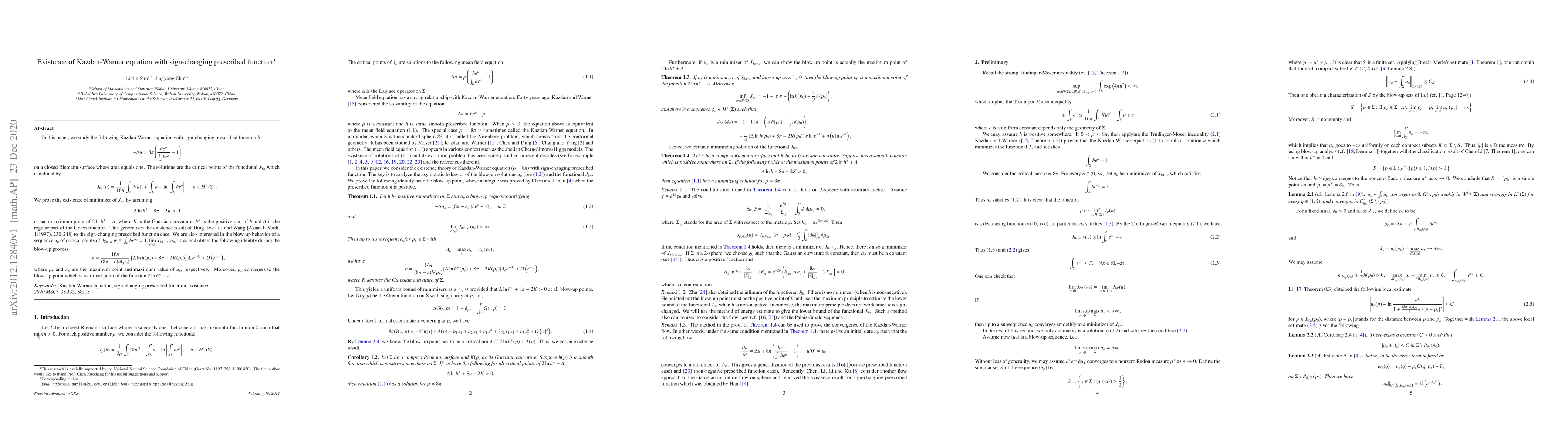This research proves the existence of solutions for Kazdan-Warner equations with sign-changing prescribed functions on closed Riemann surfaces, generalizing previous work. It also analyzes the blow-up behavior of sequences of critical points, deriving an identity describing this process.