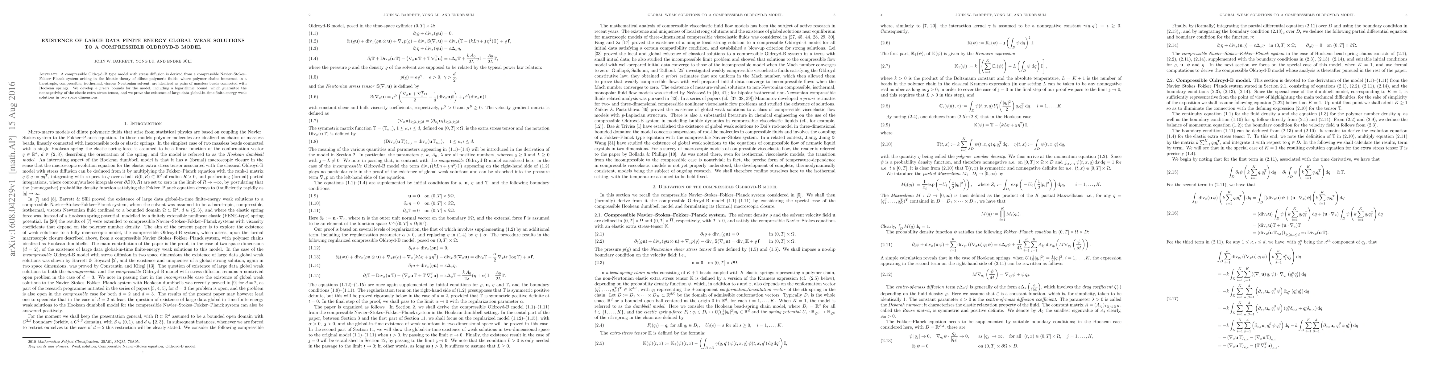 This paper derives a compressible Oldroyd-B model from kinetic theory for dilute polymeric fluids and proves the existence of large-data, global-in-time, finite-energy weak solutions in two dimensions, using a-priori bounds including a logarithmic bound to ensure nonnegativity of the elastic extra stress tensor.