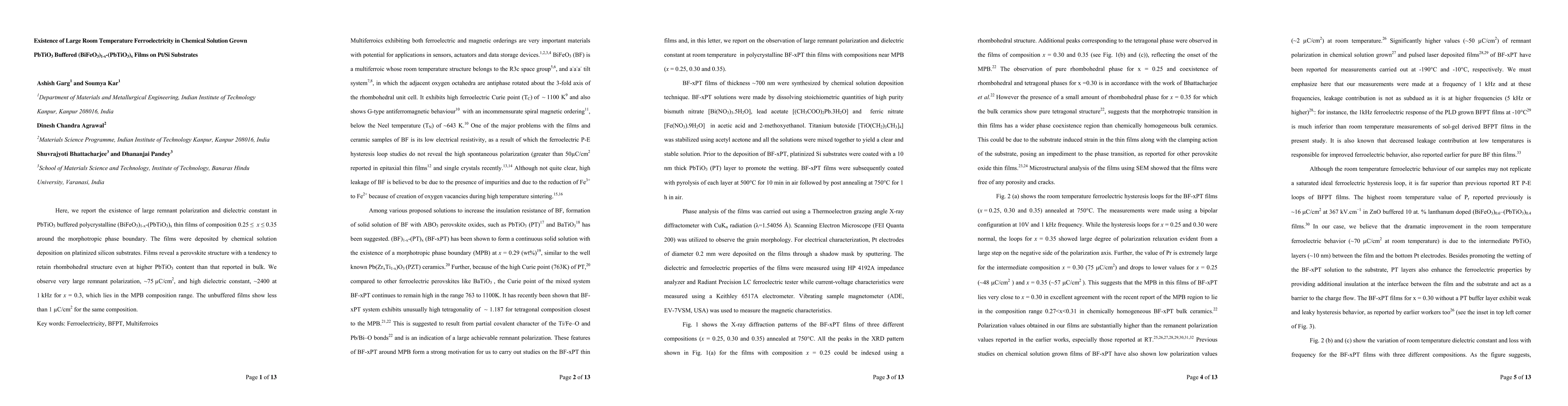 This study reports large remnant polarization and dielectric constant in PbTiO3 buffered (BiFeO3)1-x(PbTiO3)x films on Pt/Si substrates, especially for x = 0.3, showing ~75 microC/cm^2 and ~2400 at 1 kHz, due to their perovskite structure and morphotropic phase boundary composition.
