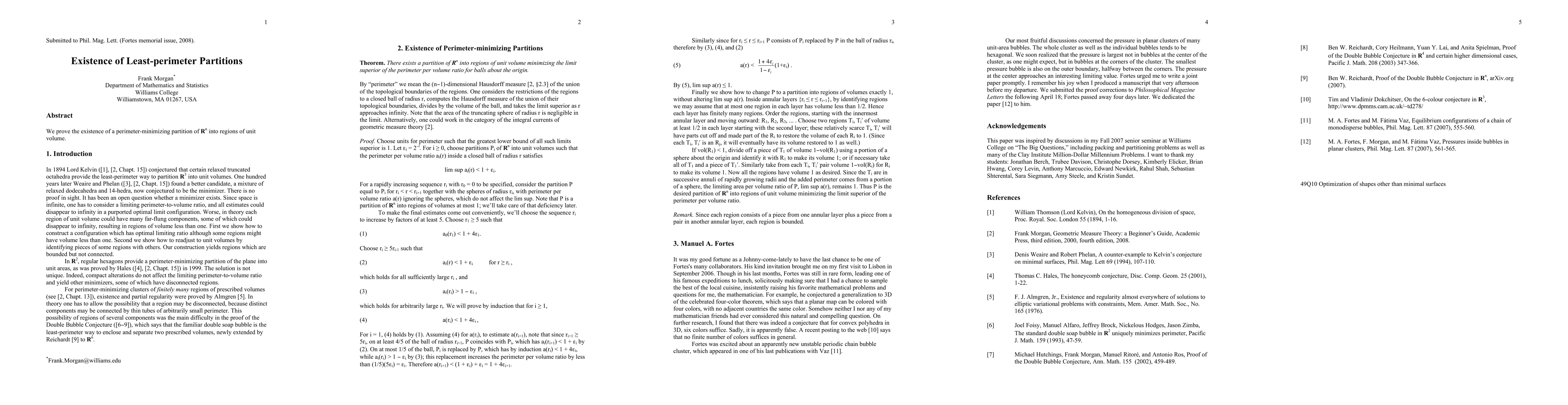 Summary: This paper establishes the existence of a partition of n-dimensional space into regions of unit volume that minimizes the total perimeter. The authors honor the memory of Manuel A. Fortes in their conclusion.