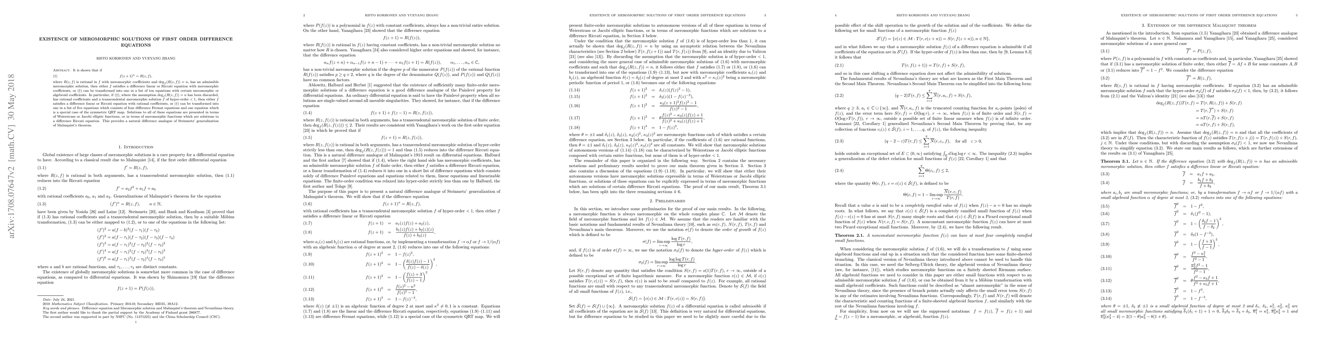 This paper demonstrates the existence of meromorphic solutions for first-order difference equations, showing that such solutions either fit specific linear or Riccati forms or can be transformed into a standardized set of equations. Special cases with rational coefficients lead to solutions expressed in terms of elliptic functions or meromorphic functions from difference Riccati equations.