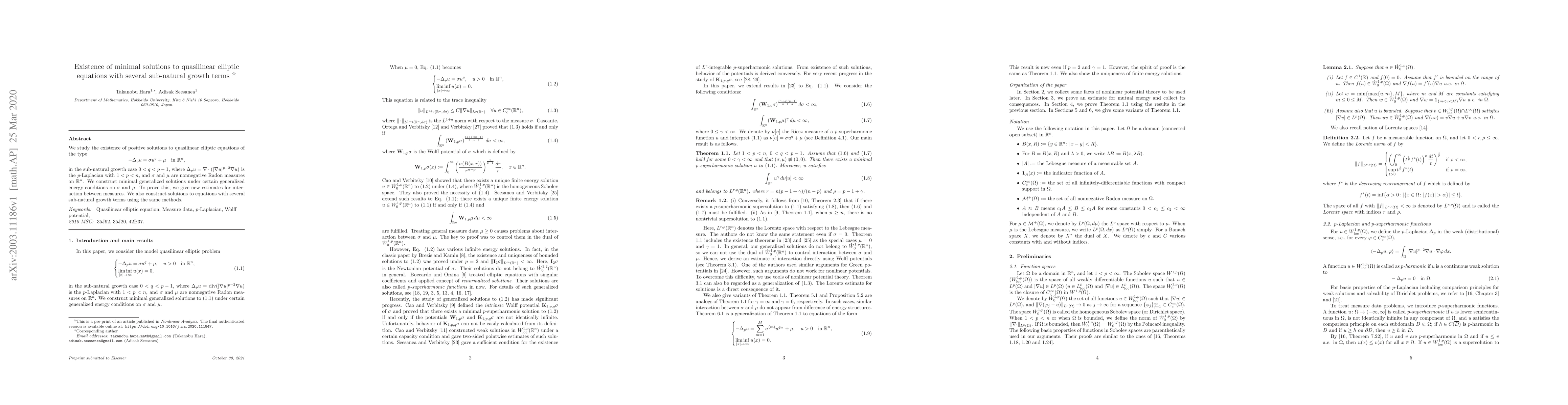 This paper investigates the existence of minimal positive solutions to quasilinear elliptic equations featuring sub-natural growth terms, specifically when $0 < q < p - 1$. The study constructs minimal generalized solutions under generalized energy conditions on the involved measures, employing new estimates for measure interactions.