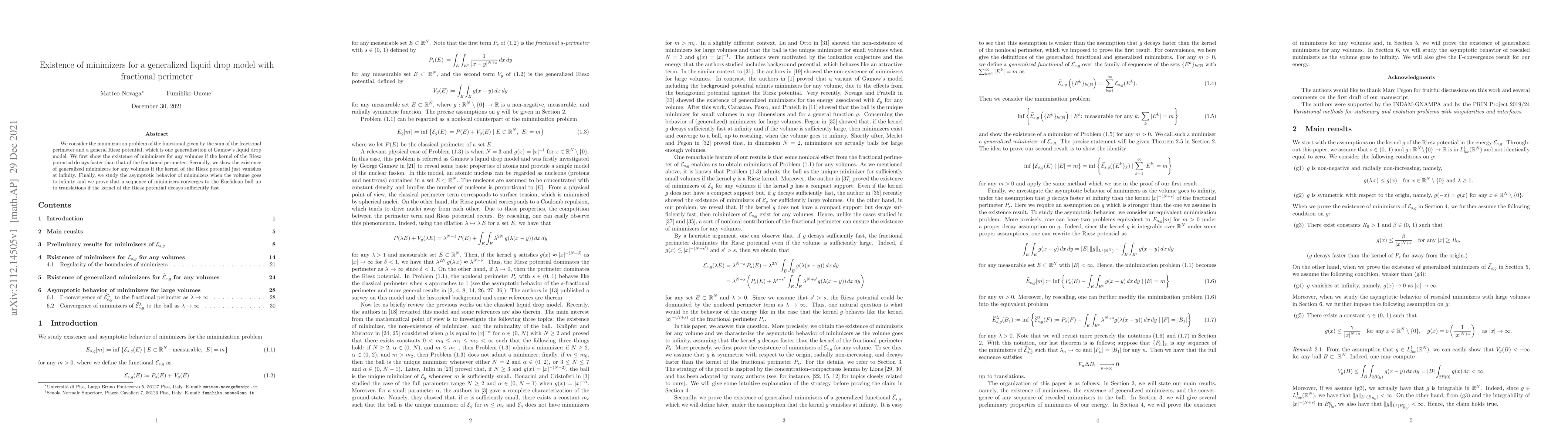 This paper proves the existence of minimizers for a functional combining fractional perimeter and a general Riesz potential, a model extending Gamow's liquid drop model. It also examines the asymptotic behavior of these minimizers, showing convergence to Euclidean balls for sufficiently fast decay of the Riesz potential.