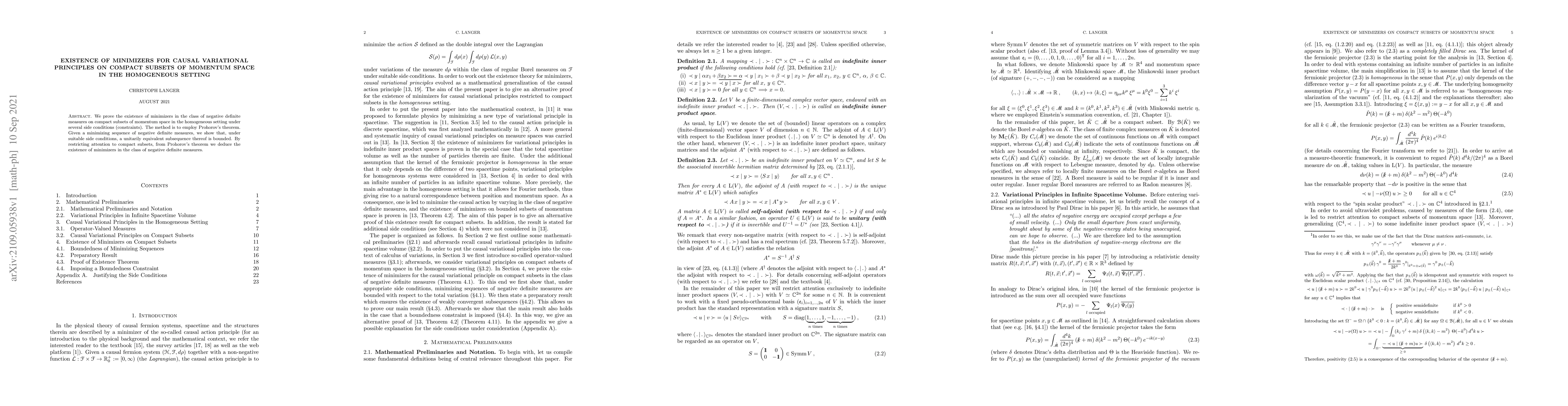 This paper proves the existence of minimizers in the class of negative definite measures on compact subsets of momentum space in a homogeneous setting, employing Prohorov's theorem to establish the boundedness of a subsequence of minimizing measures, thereby deducing the existence of minimizers.