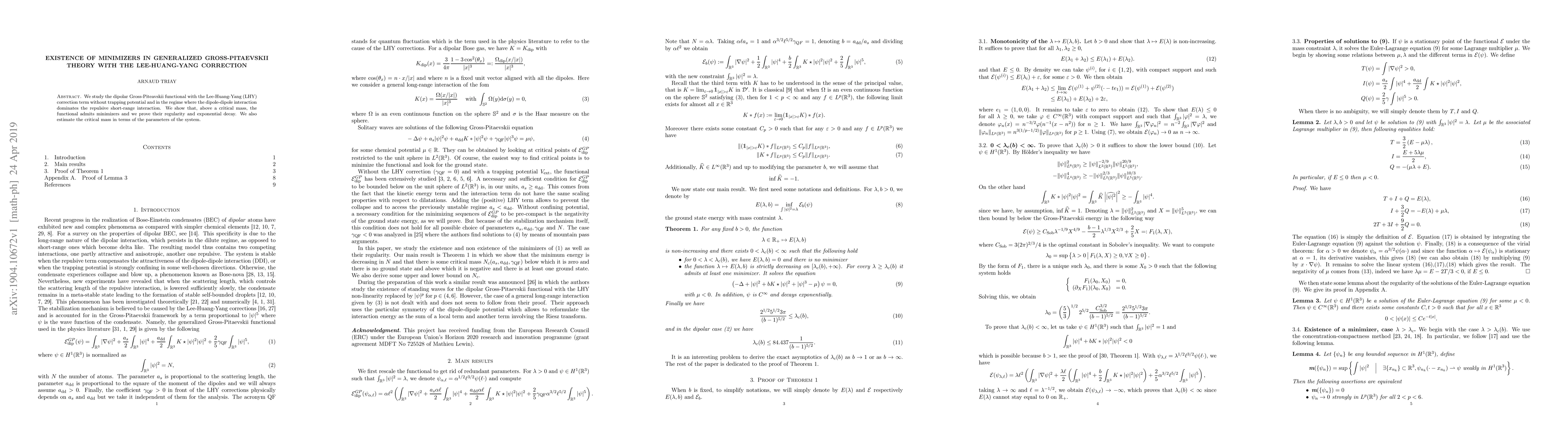 We study the dipolar Gross-Piteavskii functional with the Lee-Huang-Yang (LHY) correction term without trapping potential and in the regime where the dipole-dipole interaction dominates the repulsive short-range interaction. We show that, above a critical mass, the functional admits minimizers and we prove their regularity and exponential decay. We also estimate the critical mass in terms of the parameters of the system.