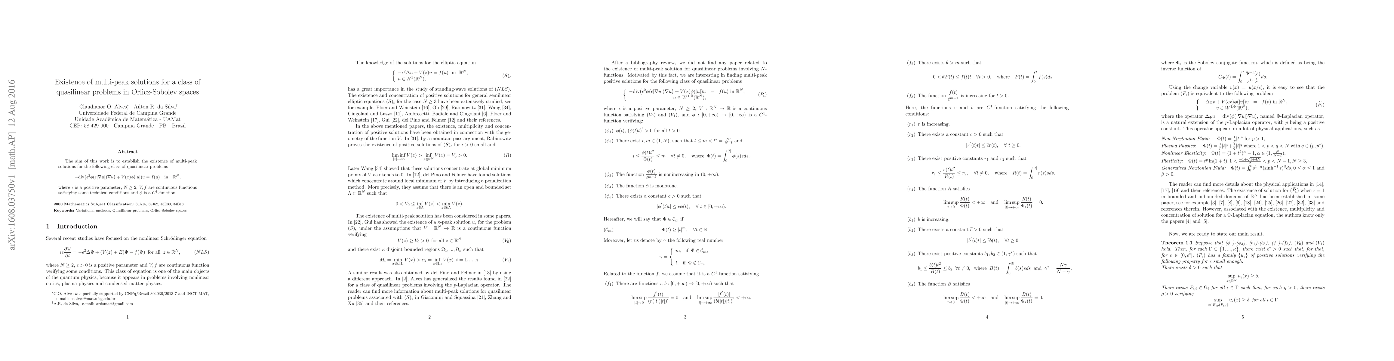 This paper establishes the existence of multi-peak solutions for a class of quasilinear problems in Orlicz-Sobolev spaces, with key conditions on functions $V$, $f$, and $ ho$. The solution relies on critical point theory and topological arguments to prove the existence of multiple solutions.