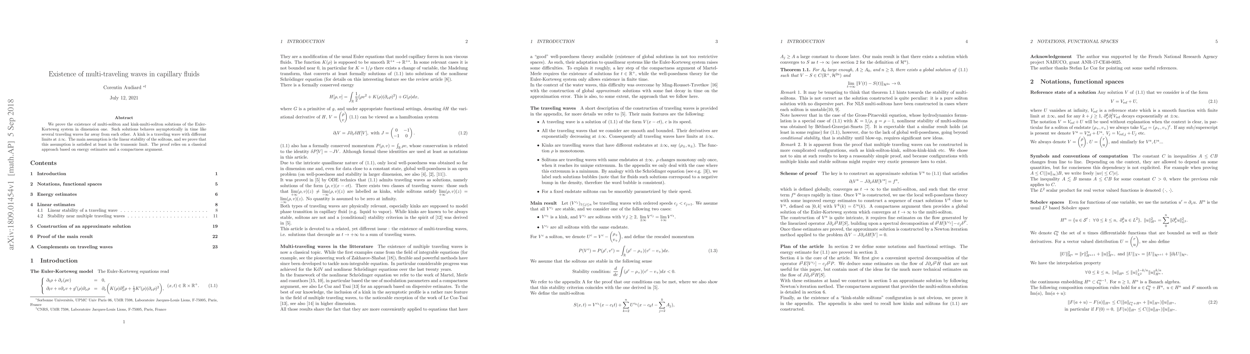This paper proves the existence of multi-soliton and kink-multi-soliton solutions in the Euler-Korteweg system, showing they behave as several traveling waves asymptotically. The study confirms linear stability of solitons, particularly in the transonic limit, using energy estimates and compactness arguments.