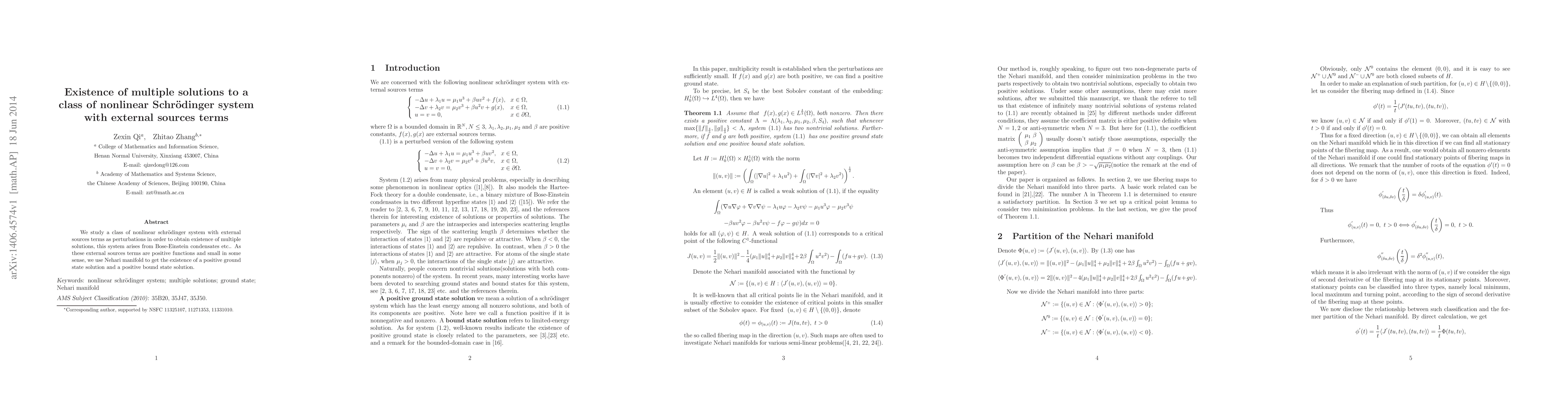 We study a class of nonlinear schr\"{o}dinger system with external sources terms as perturbations in order to obtain existence of multiple solutions, this system arises from Bose-Einstein condensates etc..As these external sources terms are positive functions and small in some sense, we use Nehari manifold to get the existence of a positive ground state solution and a positive bound state solution.