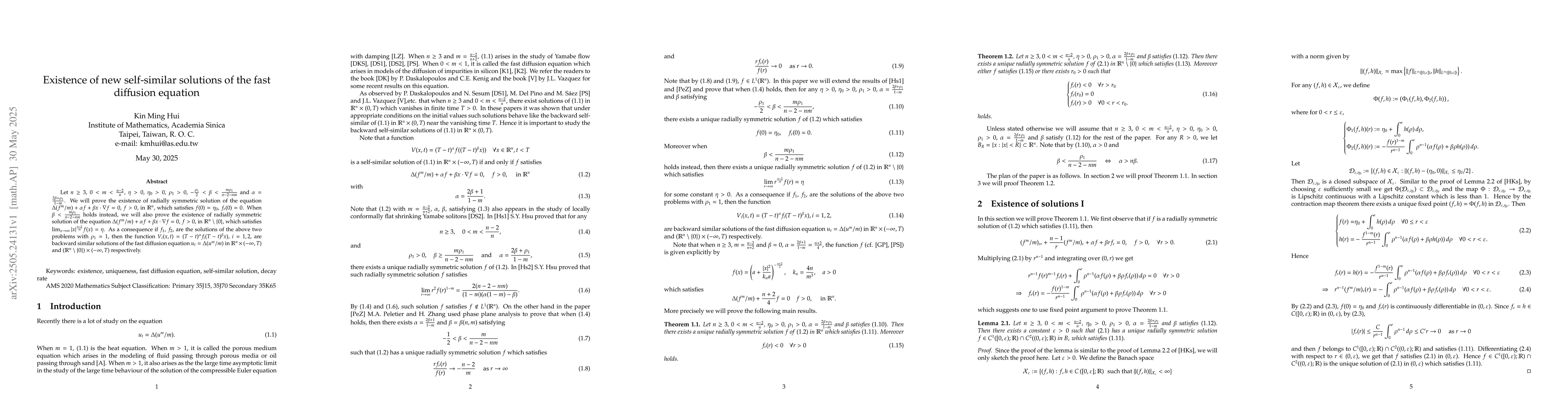 The paper presents novel proof techniques for establishing the existence of specific self-similar solutions to the fast diffusion equation.