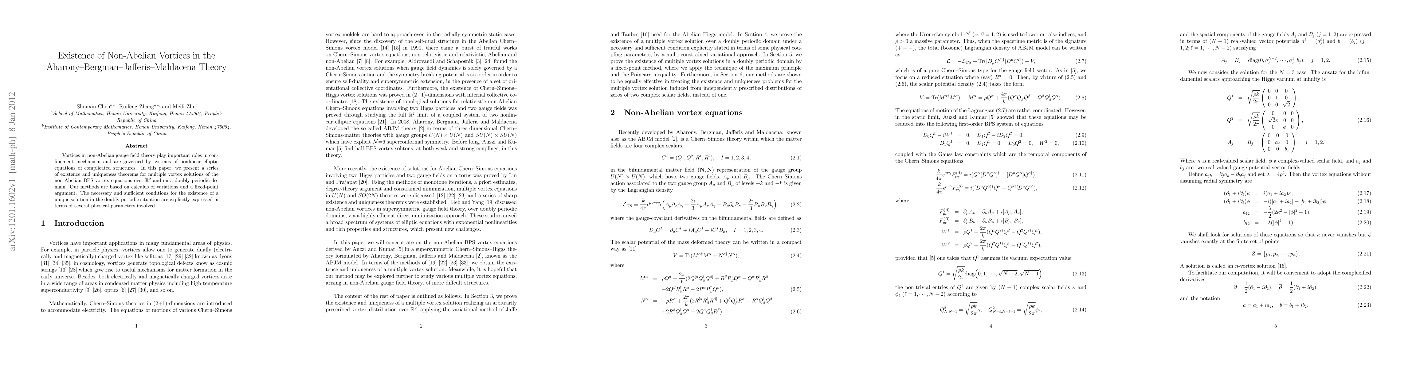 This paper establishes existence and uniqueness theorems for multiple vortex solutions in non-Abelian gauge field theory, governed by nonlinear elliptic equations. The authors employ calculus of variations and fixed-point arguments to derive necessary and sufficient conditions for these solutions in both R^2 and doubly periodic domains.