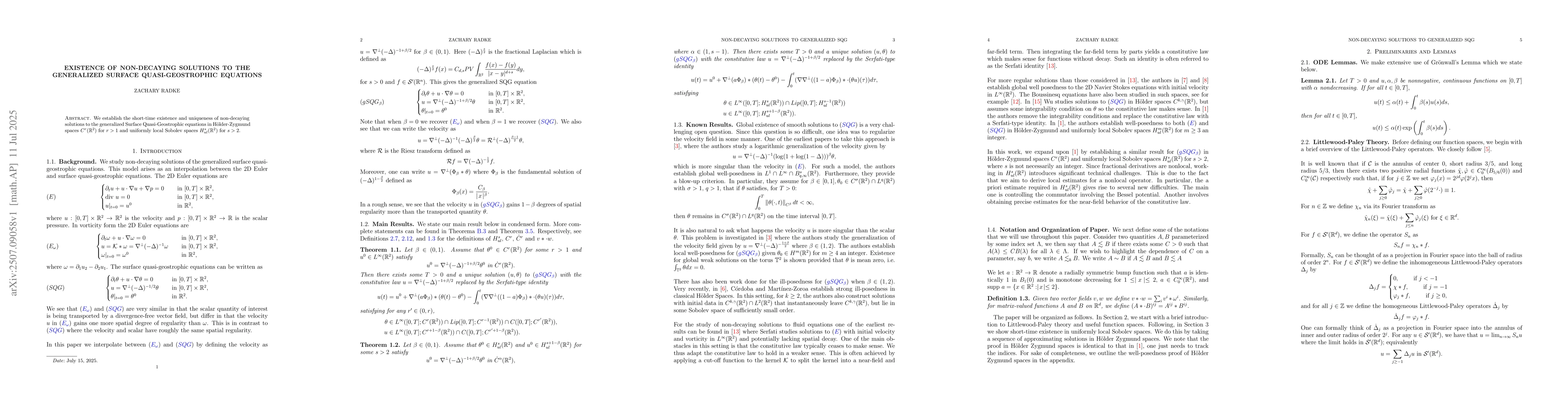 We establish the short-time existence and uniqueness of non-decaying solutions to the generalized Surface Quasi-Geostrophic equations in H\"older-Zygmund spaces $C^r(\mathbb{R}^2)$ for $r>1$ and uniformly local Sobolev spaces $H_{ul}^s(\mathbb{R}^2)$ for $s>2$.
