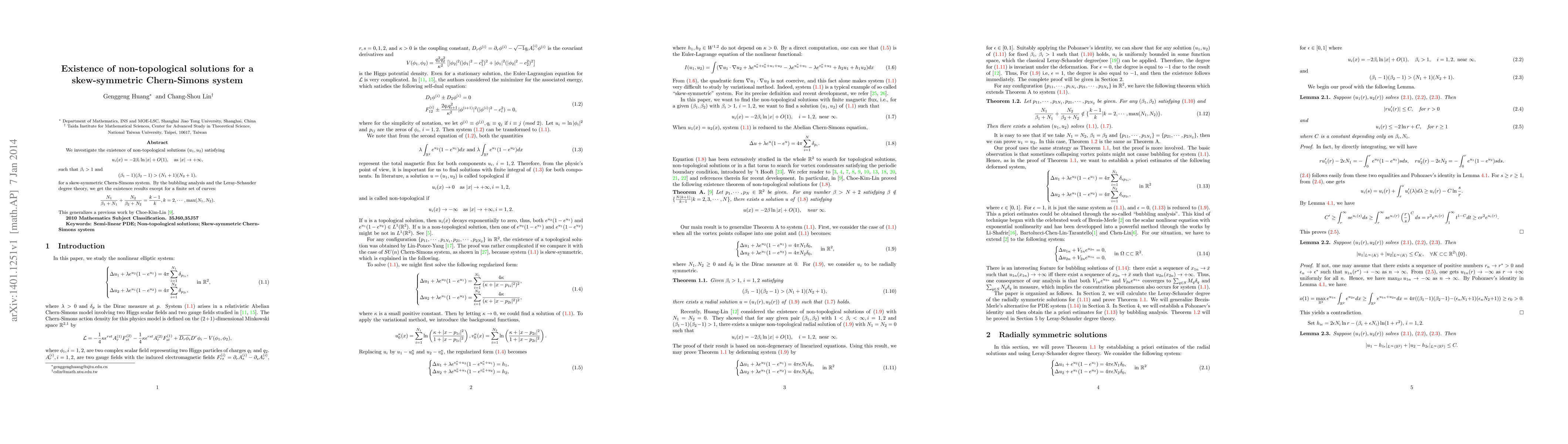 This paper explores non-topological solutions for a skew-symmetric Chern-Simons system, showing their existence through bubbling analysis and the Leray-Schauder degree theory, except for specific curves defined by the equation involving parameters β and N. This extends prior work by Choe-Kim-Lin.