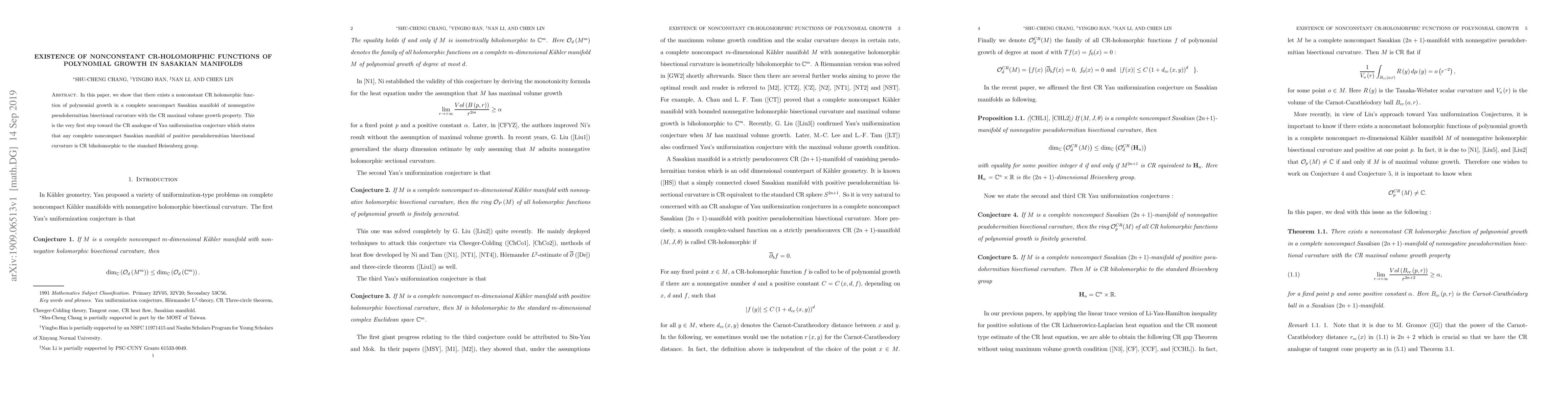 In this paper, we show that there exists a nonconstant CR holomorphic function of polynomial growth in a complete noncompact Sasakian manifold of nonnegative pseudohermitian bisectional curvature with the CR maximal volume growth property. This is the very first step toward the CR analogue of Yau uniformization conjecture which states that any complete noncompact Sasakian manifold of positive pseudohermitian bisectional curvature is CR biholomorphic to the standard Heisenberg group.