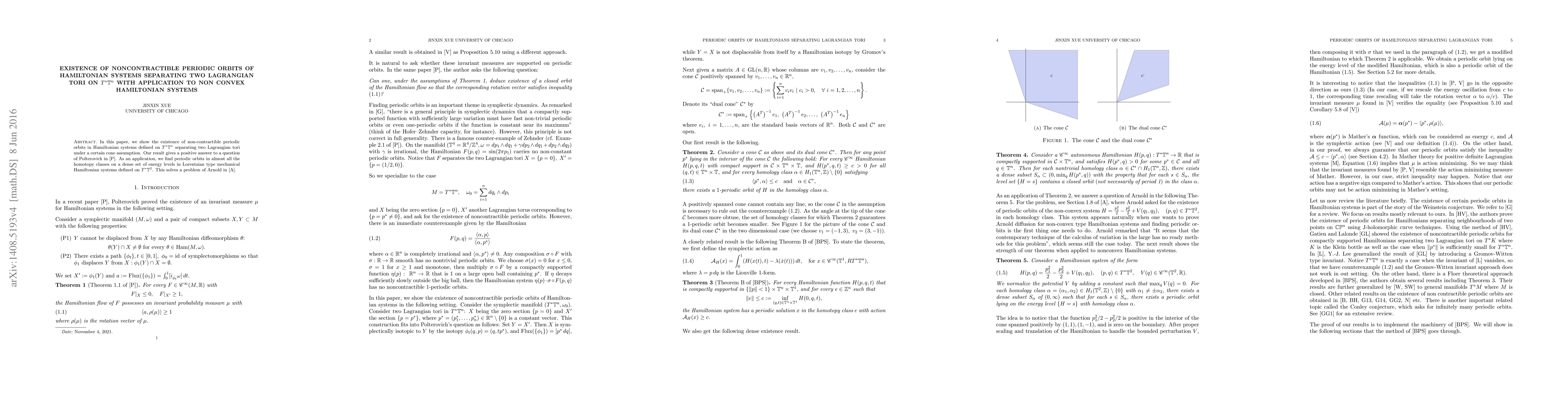 This paper demonstrates the existence of noncontractible periodic orbits in Hamiltonian systems on $T^*\T^n$ that separate two Lagrangian tori, addressing a question posed by Polterovich. An application to Lorentzian type mechanical Hamiltonian systems on $T^*\T^2$ resolves a problem proposed by Arnold.