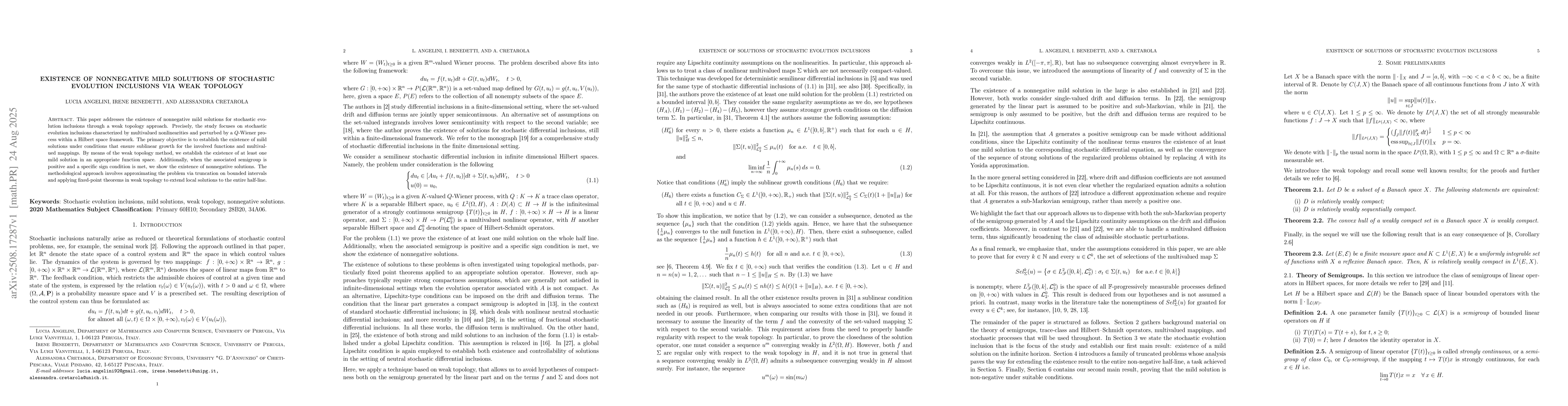 This paper addresses the existence of nonnegative mild solutions for stochastic evolution inclusions through a weak topology approach. Precisely, the study focuses on stochastic evolution inclusions characterized by multivalued nonlinearities and perturbed by a Q-Wiener process within a Hilbert space framework. The primary objective is to establish the existence of mild solutions under conditions that ensure sublinear growth for the involved functions and multivalued mappings. By means of the weak topology method, we establish the existence of at least one mild solution in an appropriate function space. Additionally, when the associated semigroup is positive and a specific sign condition is met, we show the existence of nonnegative solutions. The methodological approach involves approximating the problem via truncation on bounded intervals and applying fixed-point theorems in weak topology to extend local solutions to the entire half-line.