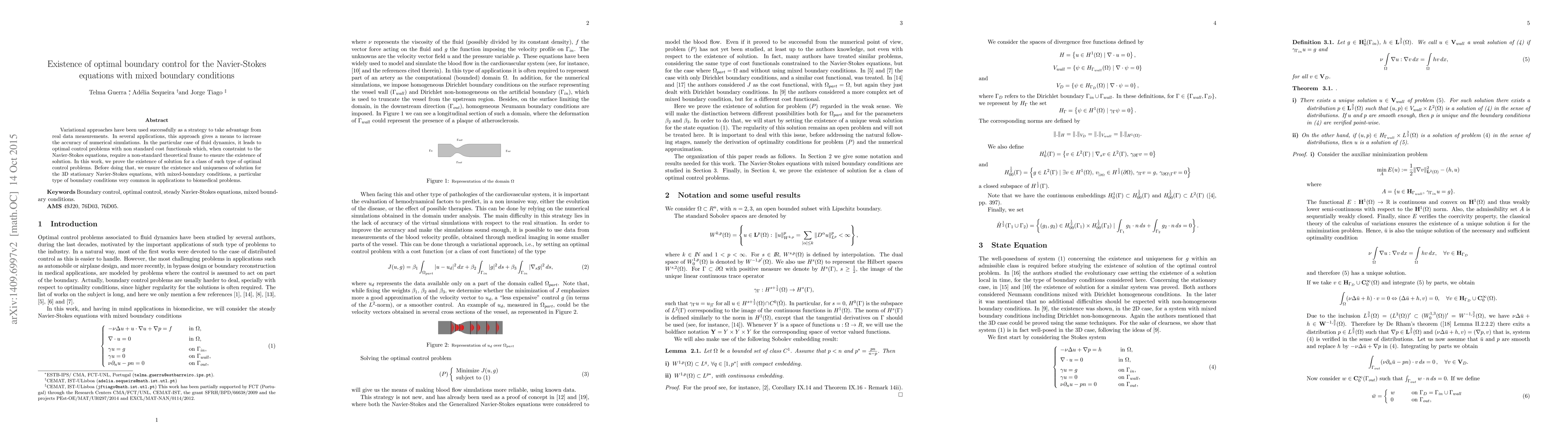 Variational approaches have been used successfully as a strategy to take advantage from real data measurements. In several applications, this approach gives a means to increase the accuracy of numerical simulations. In the particular case of fluid dynamics, it leads to optimal control problems with non standard cost functionals which, when constraint to the Navier-Stokes equations, require a non-standard theoretical frame to ensure the existence of solution. In this work, we prove the existence of solution for a class of such type of optimal control problems. Before doing that, we ensure the existence and uniqueness of solution for the 3D stationary Navier-Stokes equations, with mixed-boundary conditions, a particular type of boundary conditions very common in applications to biomedical problems.