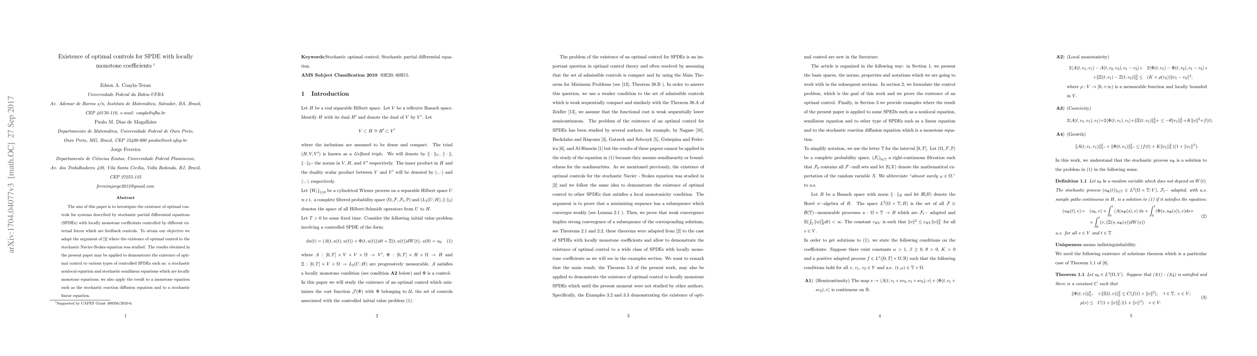 The aim of this paper is to investigate the existence of optimal controls for systems described by stochastic partial differential equations (SPDEs) with locally monotone coefficients controlled by different external forces which are feedback controls. To attain our objective we adapt the argument of H. Lisei, (Existence of optimal and epsilon-optimal controls for the stochastic Navier - Stokes equation, Nonlinear Analysis, 51, (2002) 95-118) where the existence of optimal control to the stochastic Navier-Stokes equation was studied. The results obtained in the present paper may be applied to demonstrate the existence of optimal control to various types of controlled SPDEs such as: a stochastic nonlocal equation and stochastic semilinear equations which are locally monotone equations; we also apply the result to a monotone equation such as the stochastic reaction diffusion equation and to a stochastic linear equation.