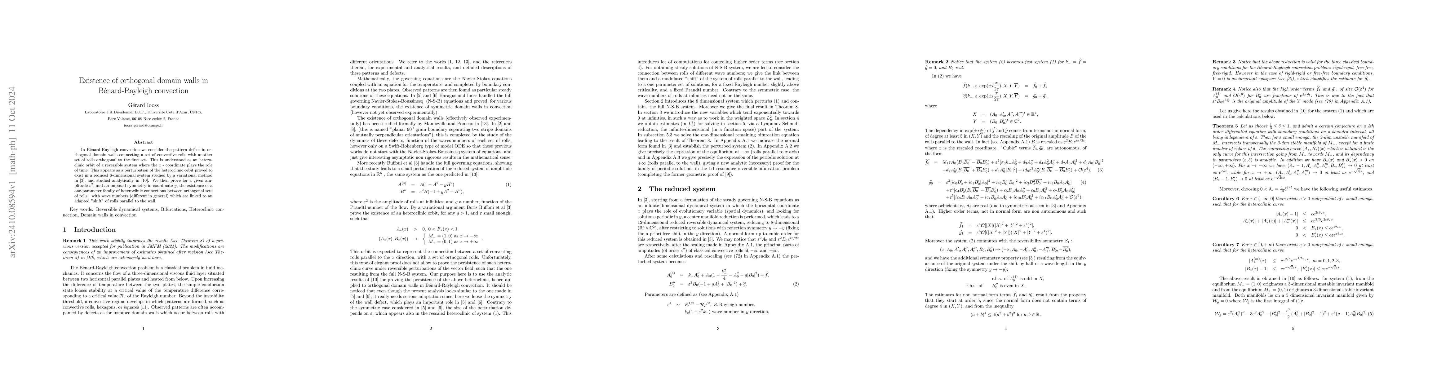 In B{\'e}nard-Rayleigh convection we consider the pattern defect in orthogonal domain walls connecting a set of convective rolls with another set of rolls orthogonal to the first set. This is understood as an heteroclinic orbit of a reversible system where the x-coordinate plays the role of time. This appears as a perturbation of the heteroclinic orbit proved to exist in a reduced 6-dimensional system studied by a variational method in [3], and studied analytically in [10]. We then prove for a given amplitude, and an imposed symmetry in coordinate y, the existence of a one parameter family of heteroclinic connections between orthogonal sets of rolls, with wave numbers (different in general) which are linked to an adapted ''shift'' of rolls parallel to the wall.